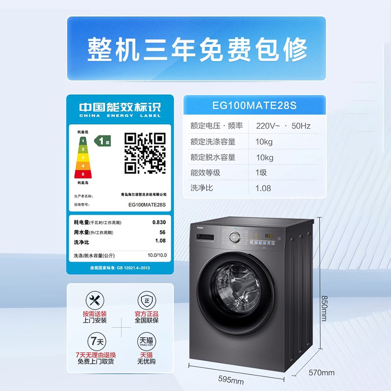 商品介绍:海尔滚筒洗衣机10kg洗脱一体除菌变频MATE28