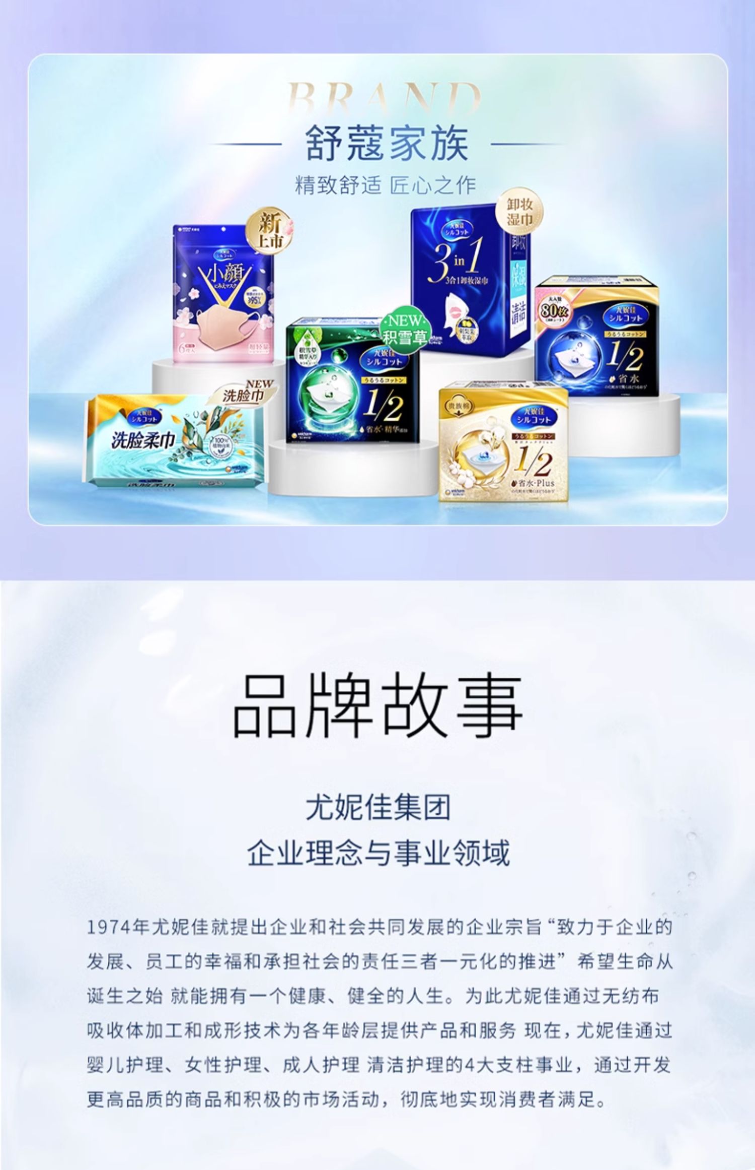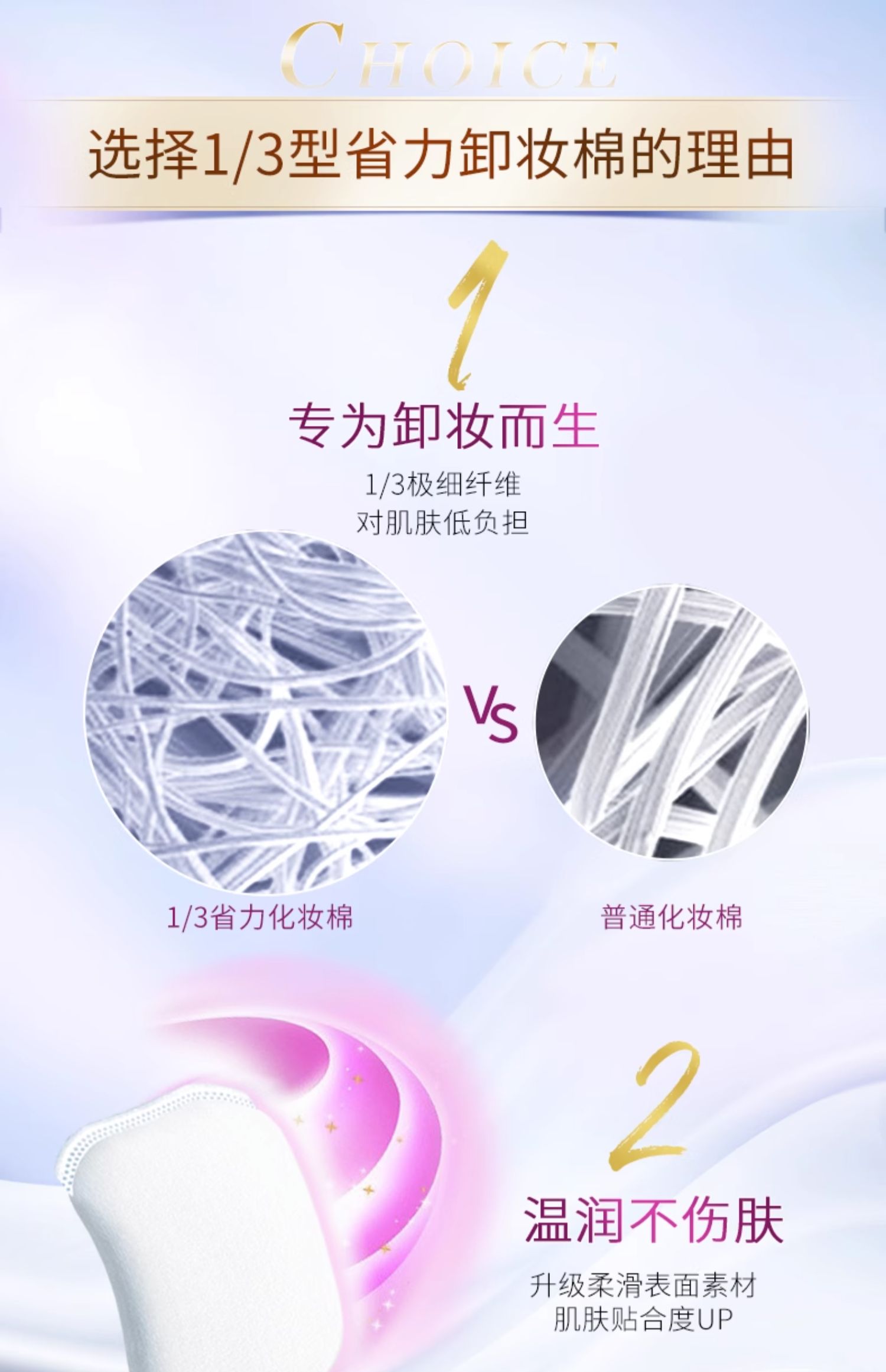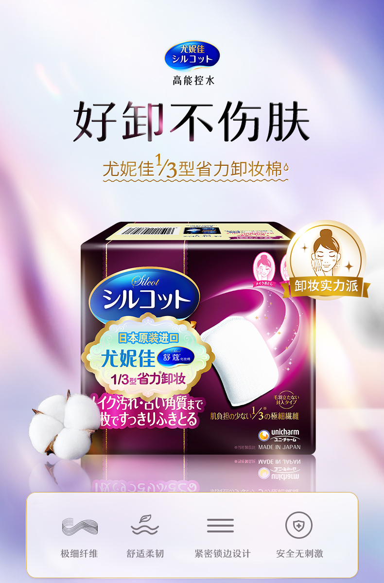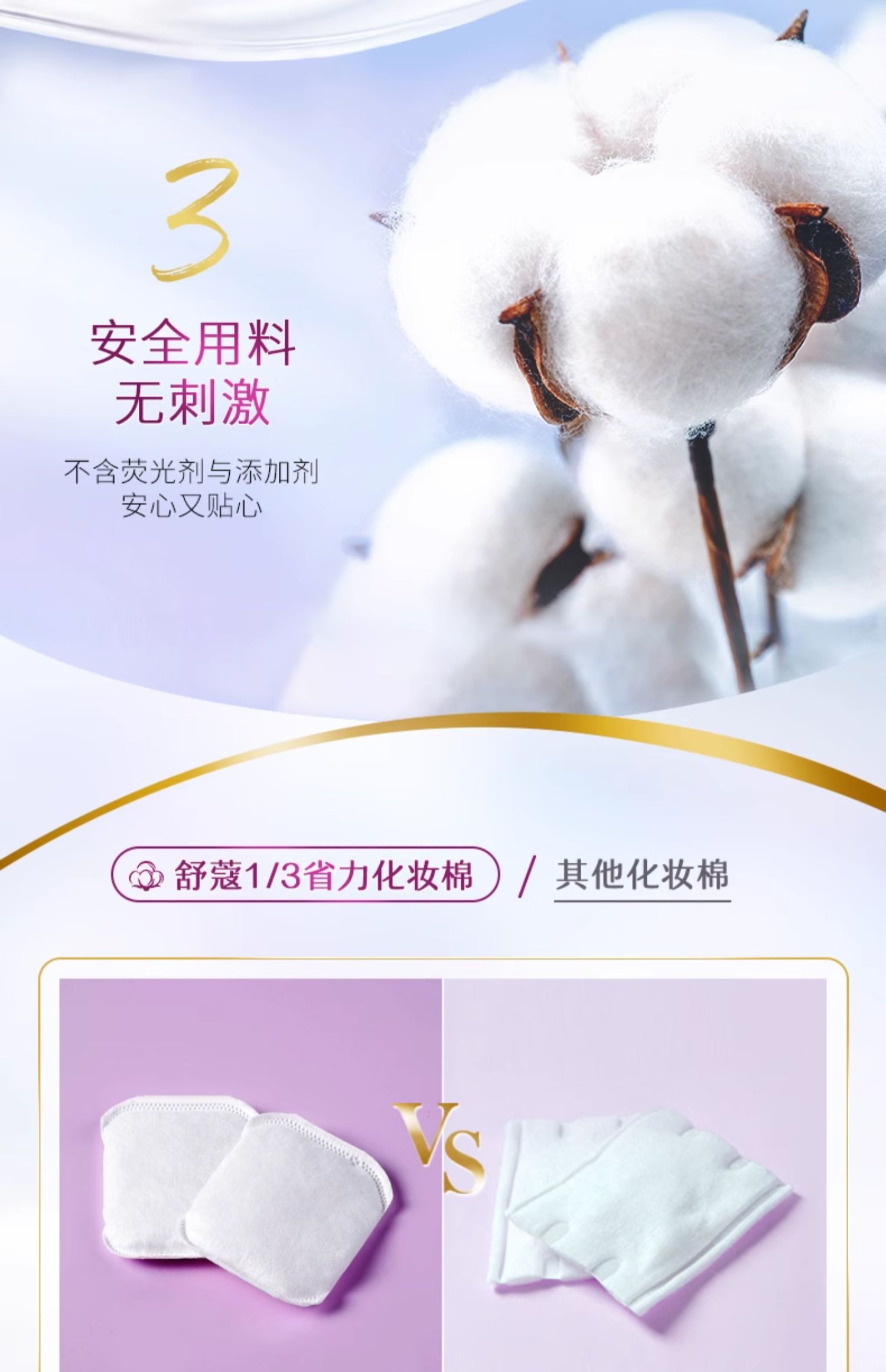 商品简介:凑单再减13.3,一套73折,买即送修护面膜1片,买2套送修护面膜1片+卸妆巾2片(不叠加)】尤妮佳舒蔻化妆棉片厚实肤感柔软,柔韧性强不易掉絮,轻松卸彩妆不破损变形,安全用料,无刺激,不含荧光剂与添加剂,安心又贴心