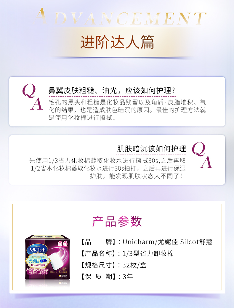 商品介绍:3盒【尤妮佳】舒蔻1/3加厚柔软化妆棉