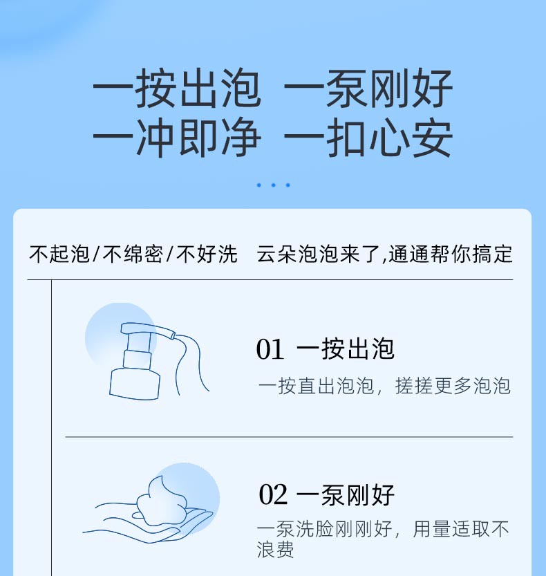 商品简介:【到手3瓶*150ml】云朵洁面泡,净透温润,洗脸爱上云朵泡泡,3重氨基酸表活+3重玻尿酸,层层充盈水润,洗出水润肌肤!【退货运费险】