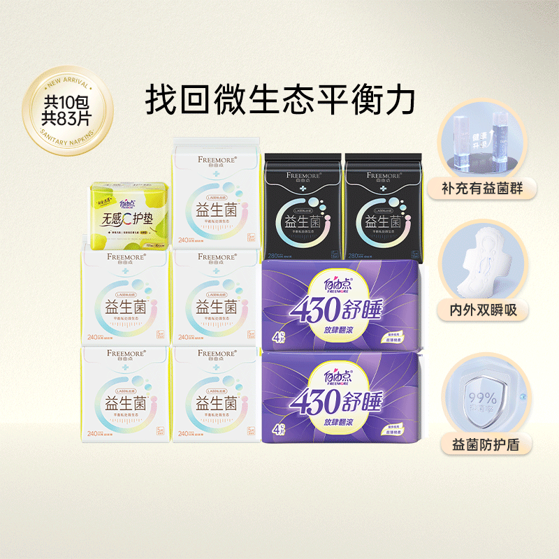 商品简介:【猫卡20元,可凑单199-35元更优惠】自由点益生菌卫生巾日夜组合姨妈巾套装平衡菌群内外瞬吸83片!!!