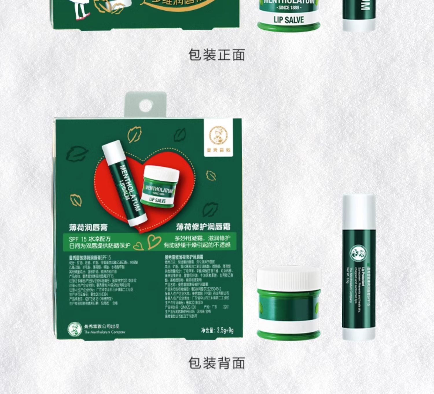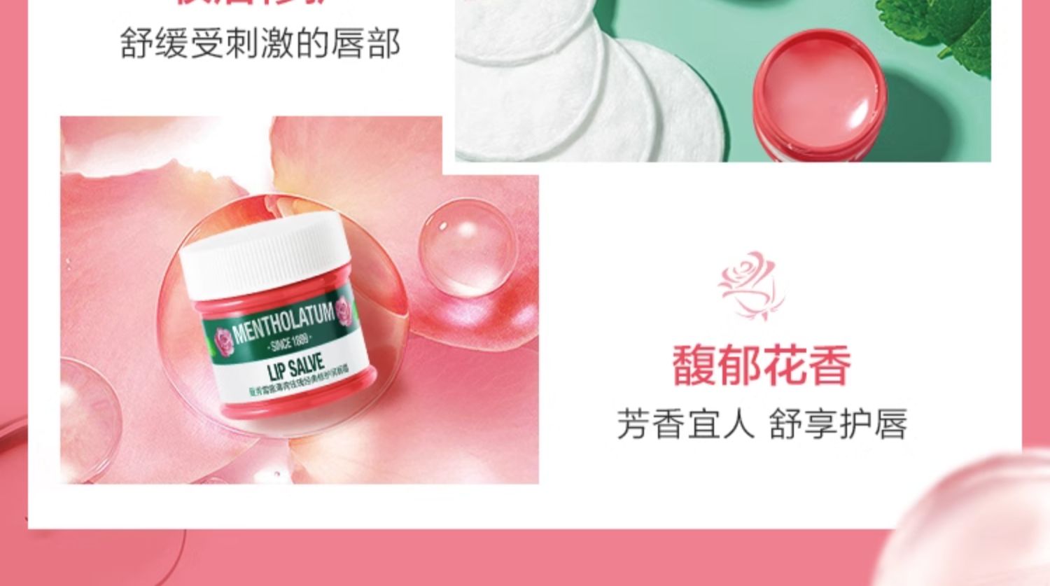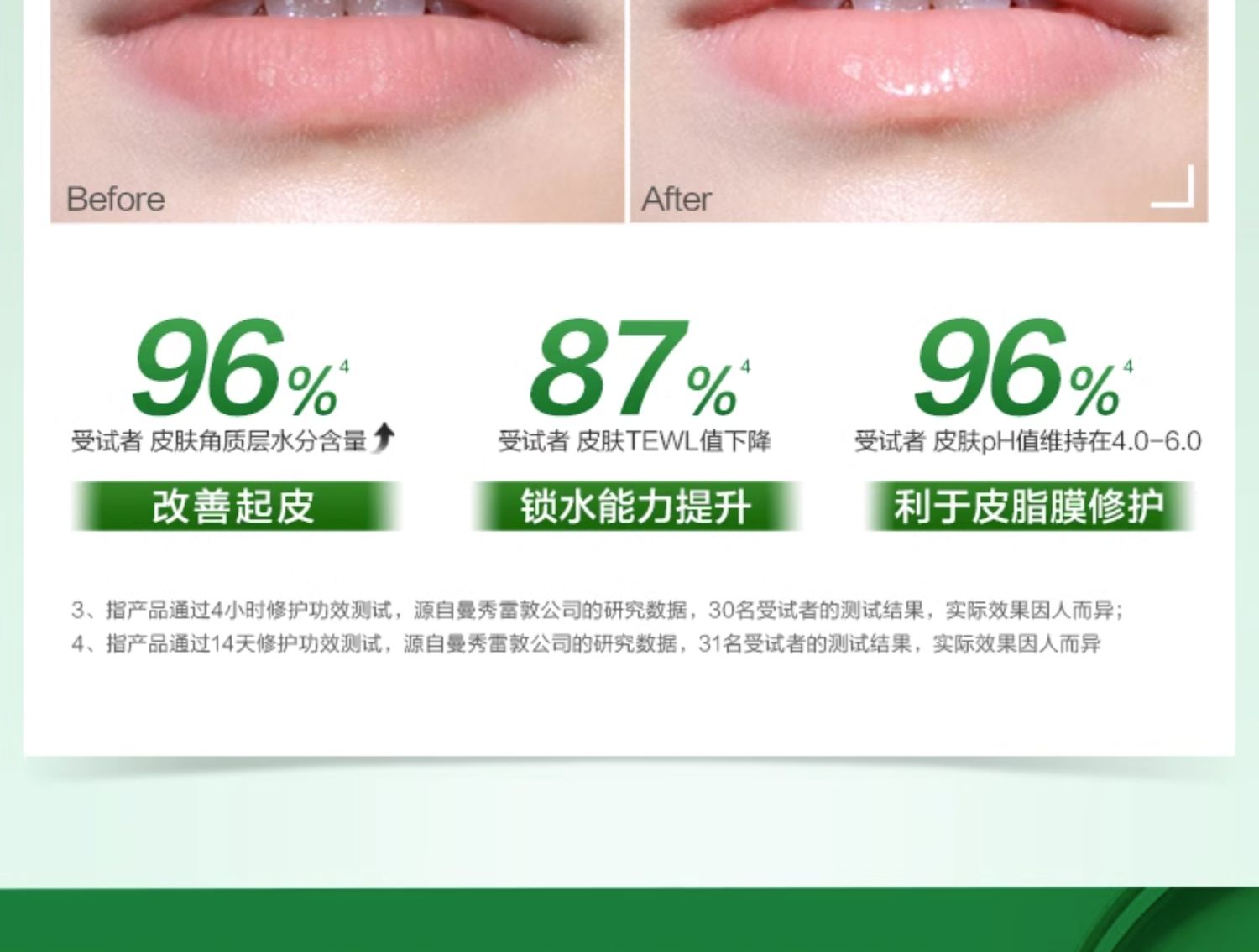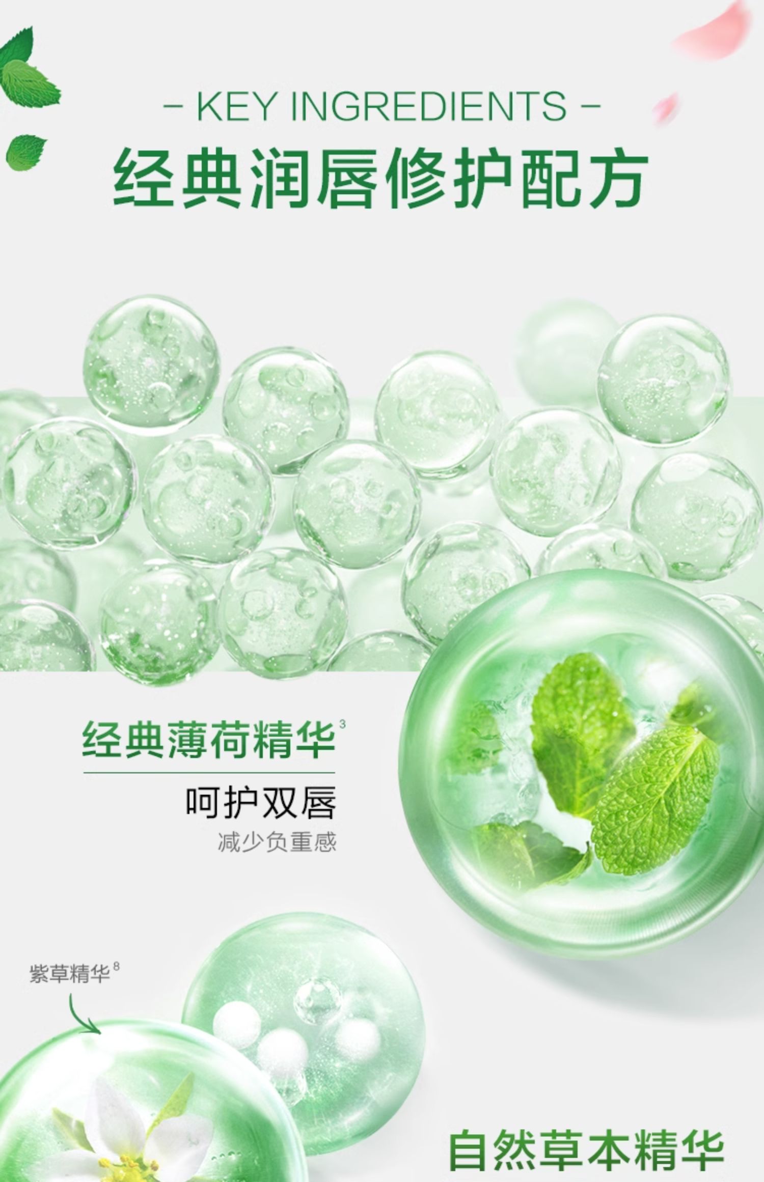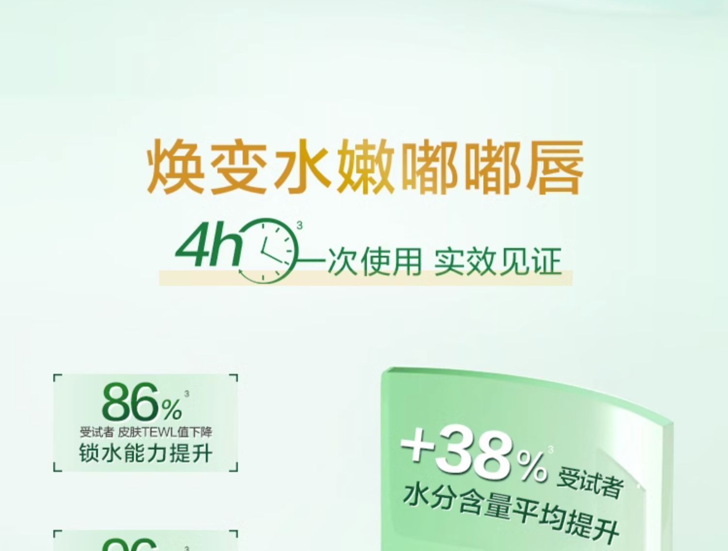 商品简介:天然草本精华,添加专利舒缓成分,唇膜级功效,深层滋养水嫩Q弹!多重植物油锁水保湿,构建嘴唇屏障~