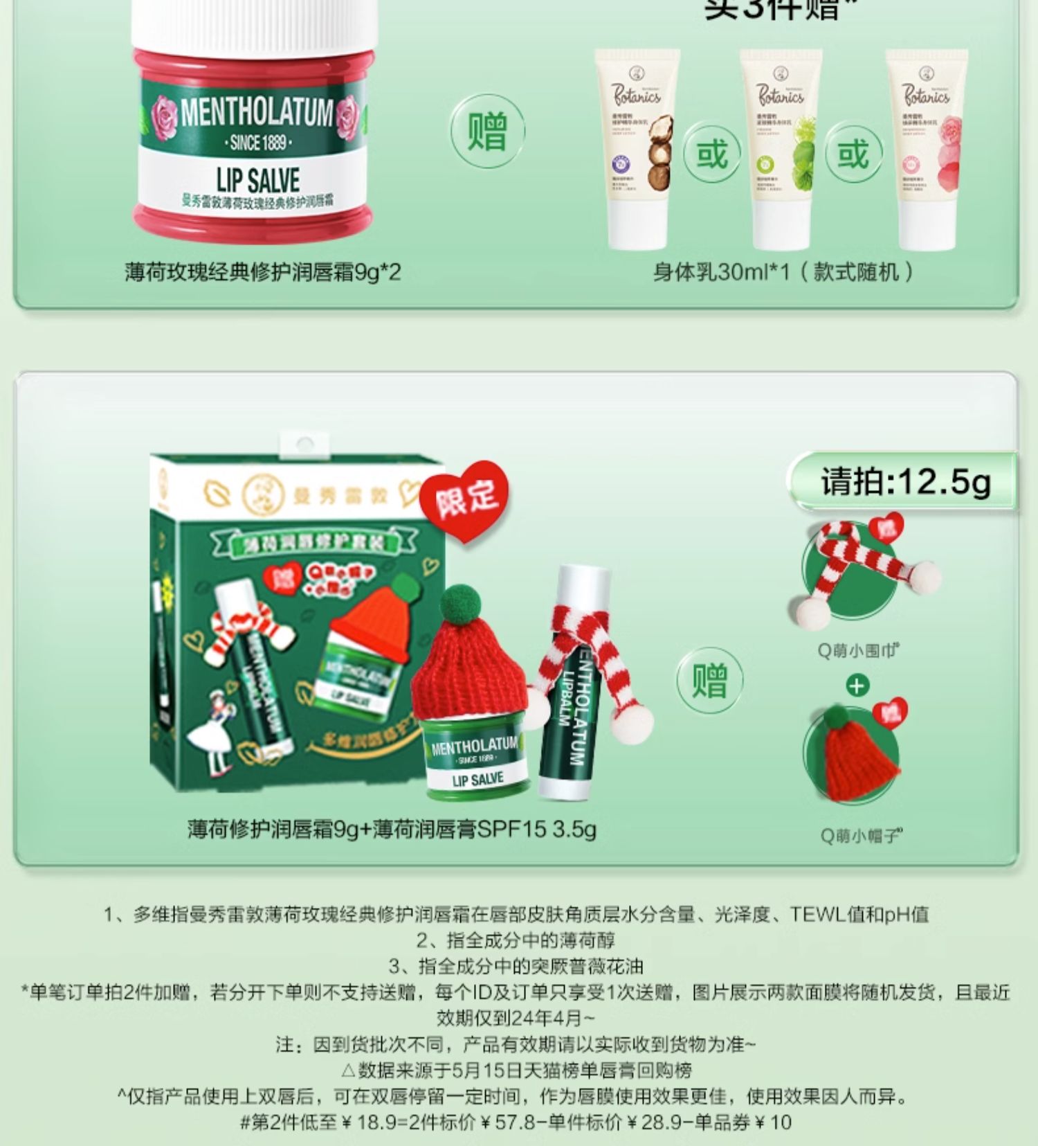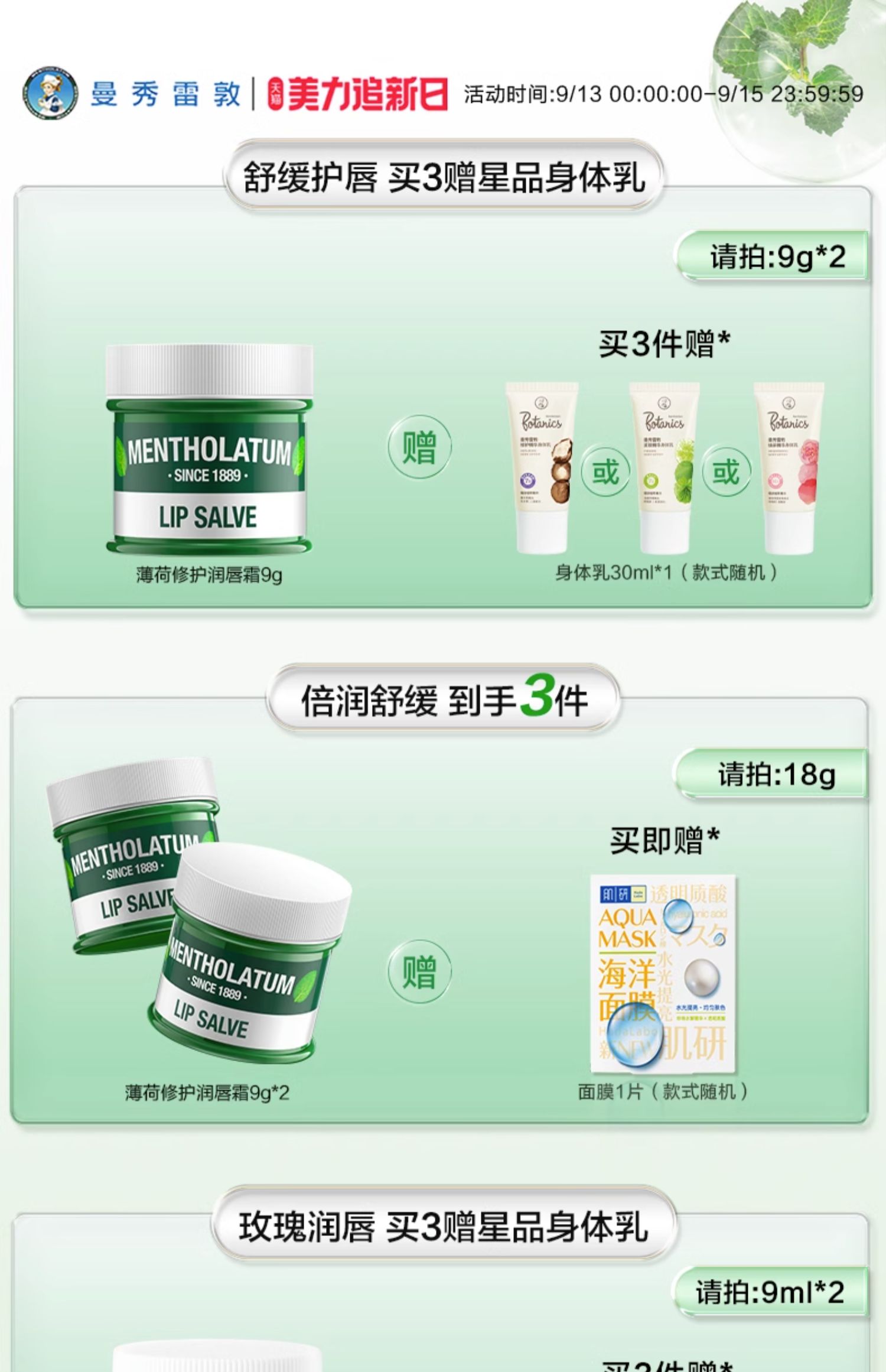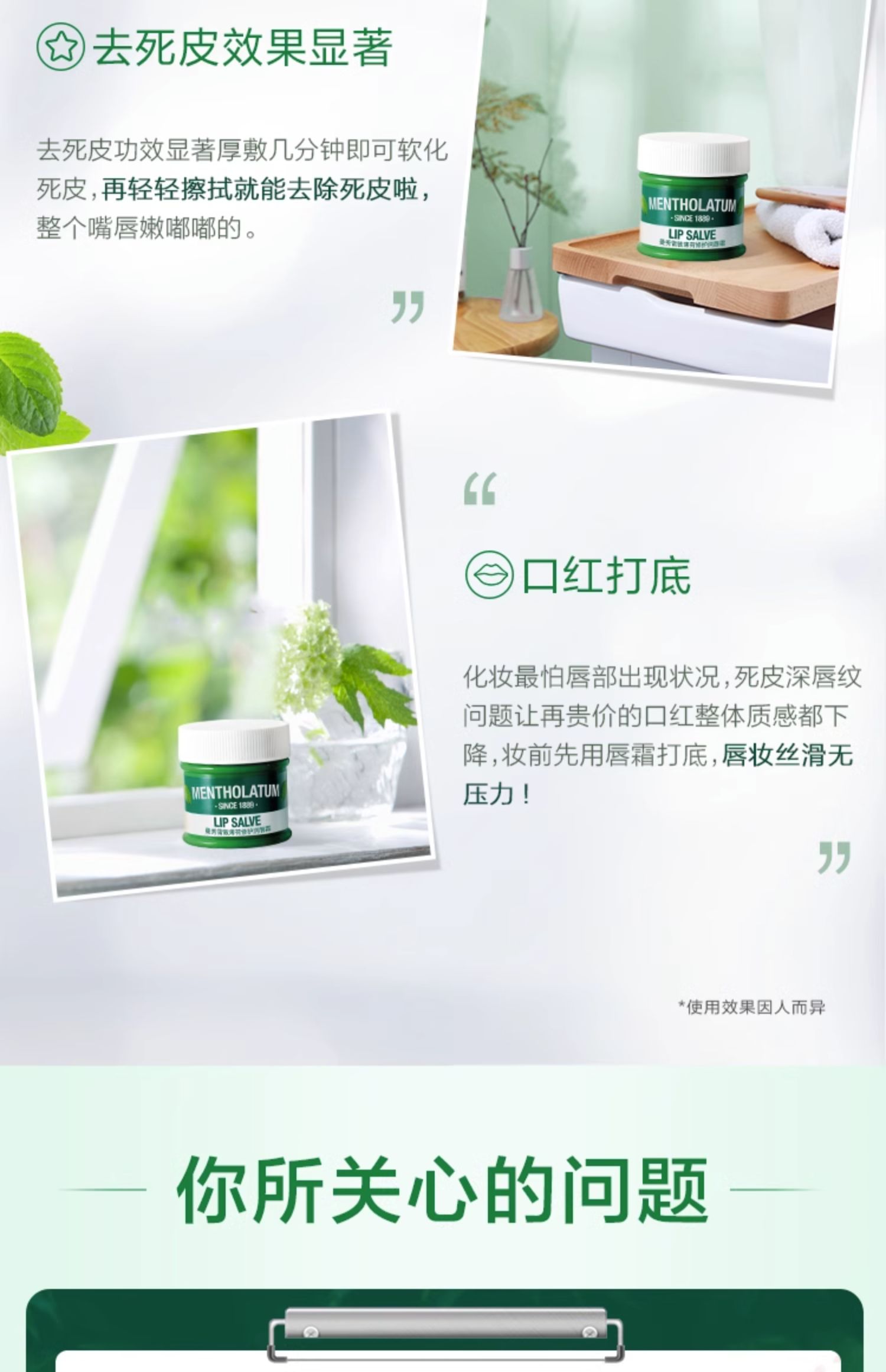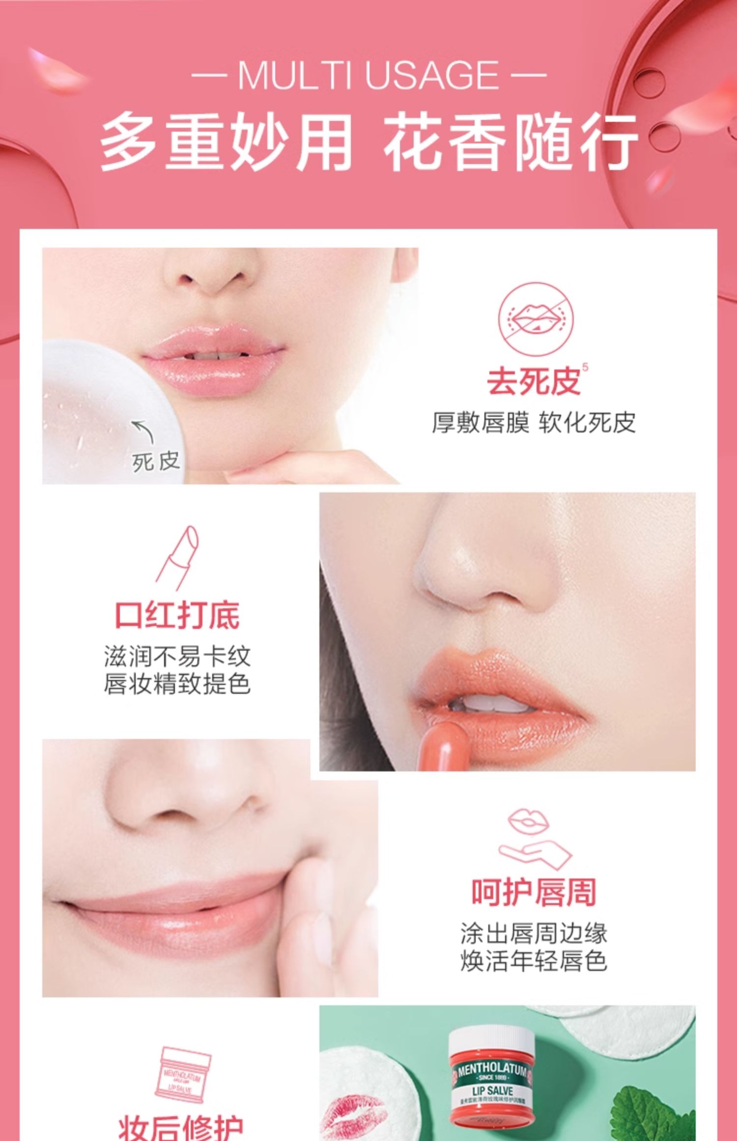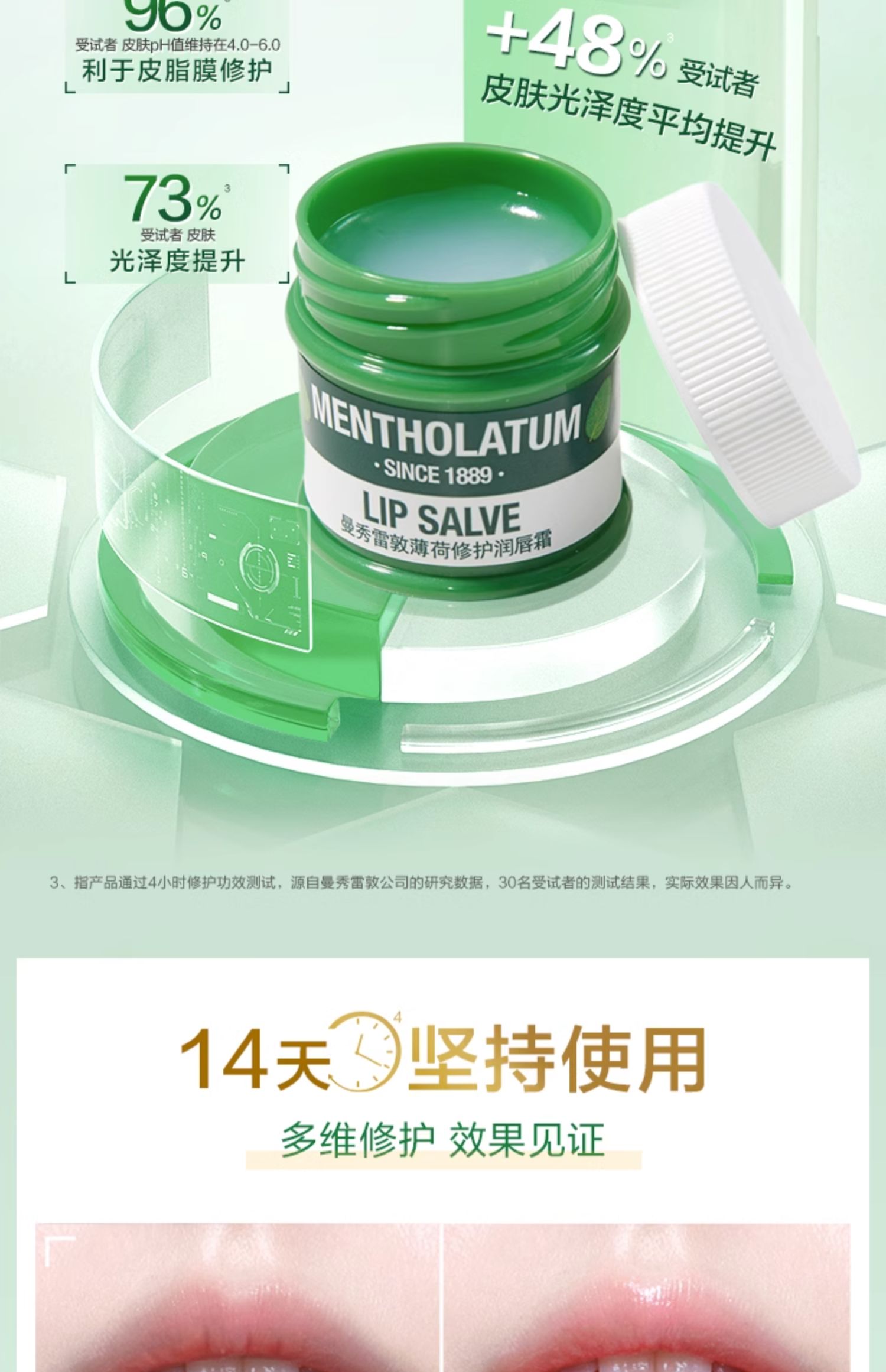 商品简介:天然草本精华,添加专利舒缓成分,唇膜级功效,深层滋养水嫩Q弹!多重植物油锁水保湿,构建嘴唇屏障~