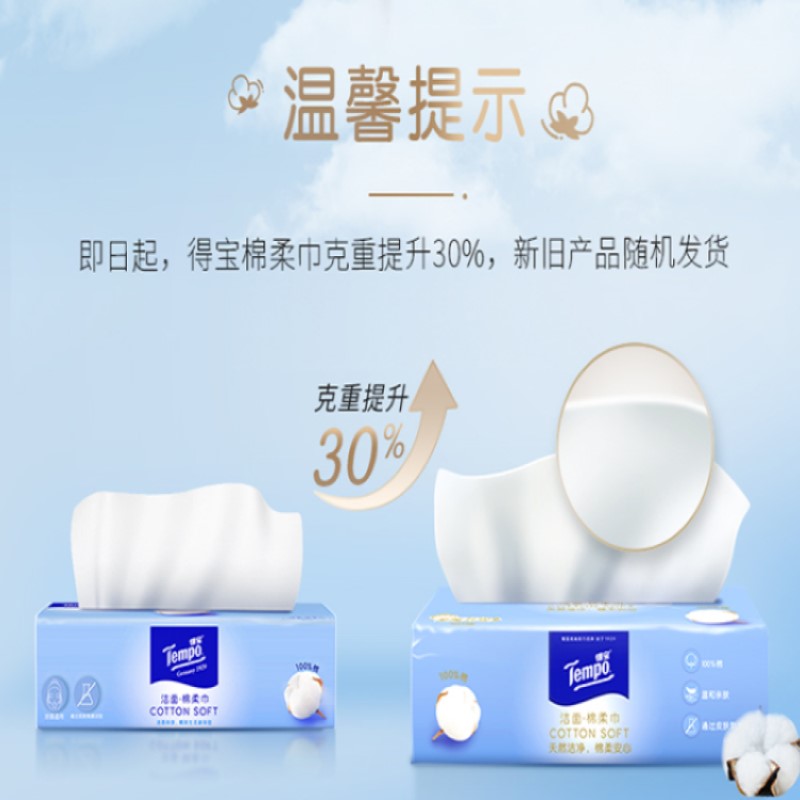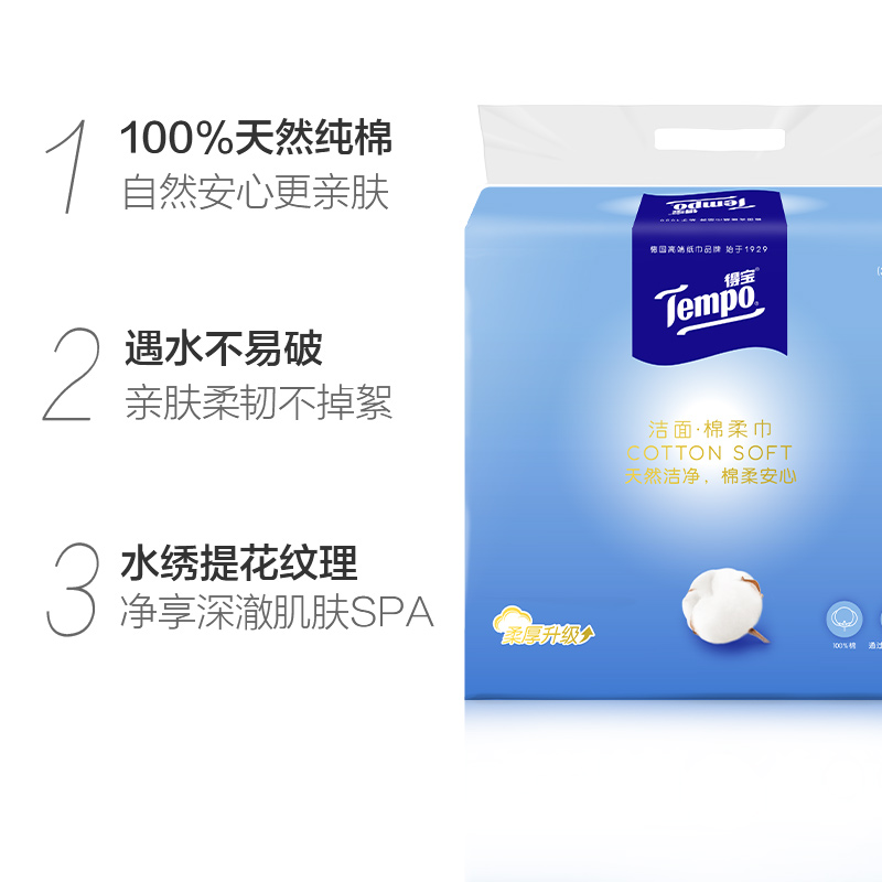 商品名称:【克重升级】Tempo/得宝棉柔巾纯棉干湿两用加厚柔软洗脸90抽*3包