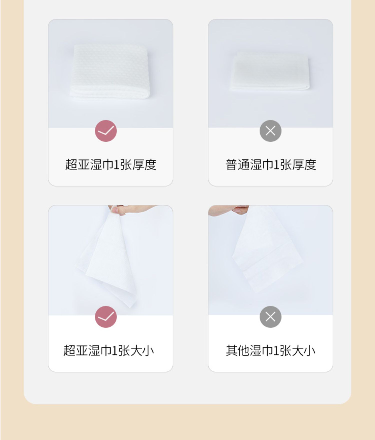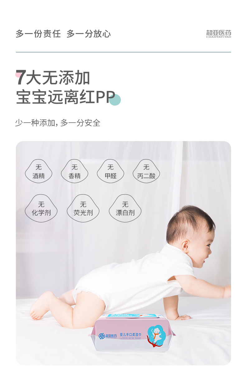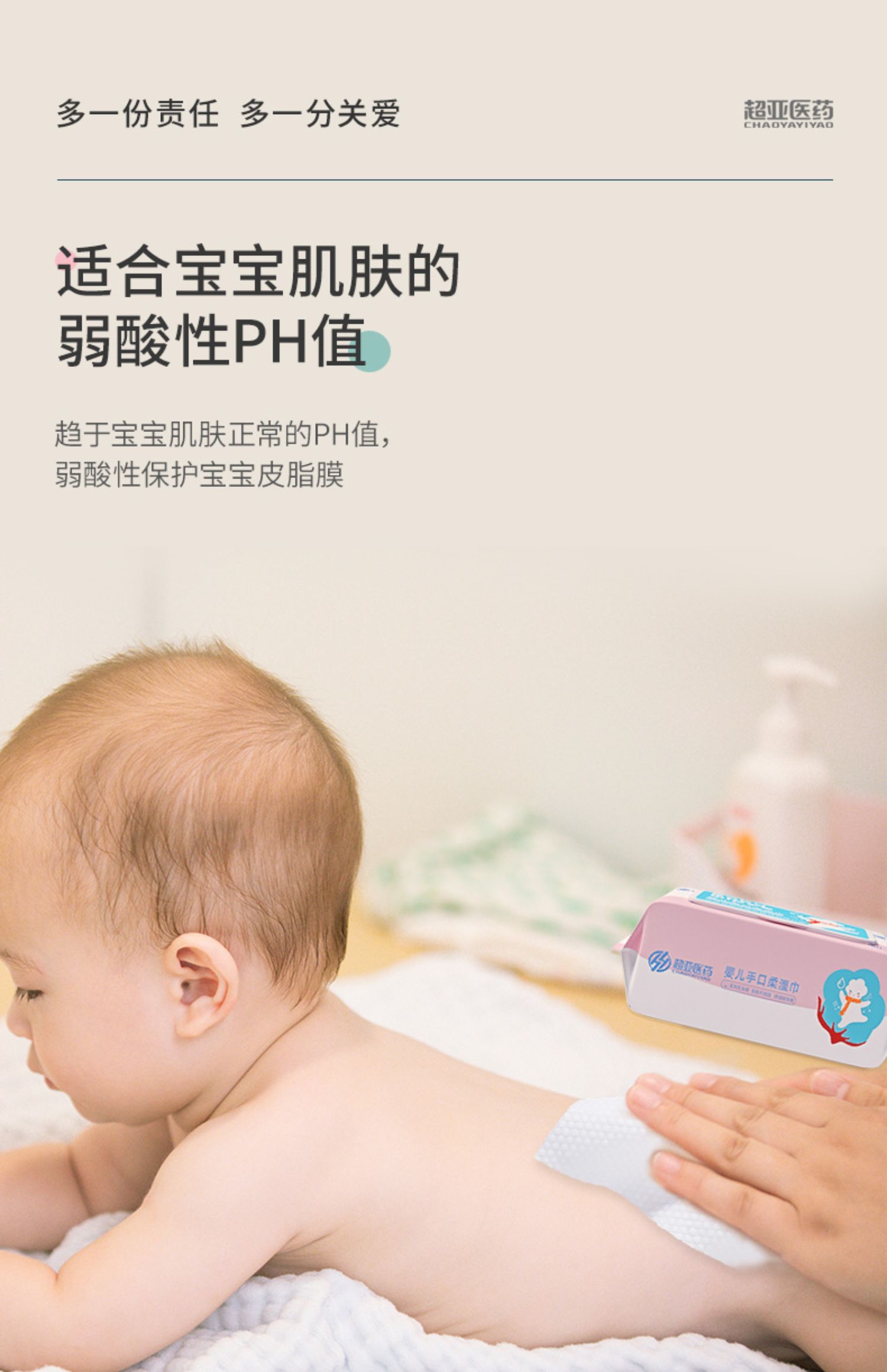商品简介:超亚手口湿巾,无敏配方,严格高标准,7大无添加,珍珠设计,加倍清洁,10万级净化车间,全自动生产,承诺安全放心!