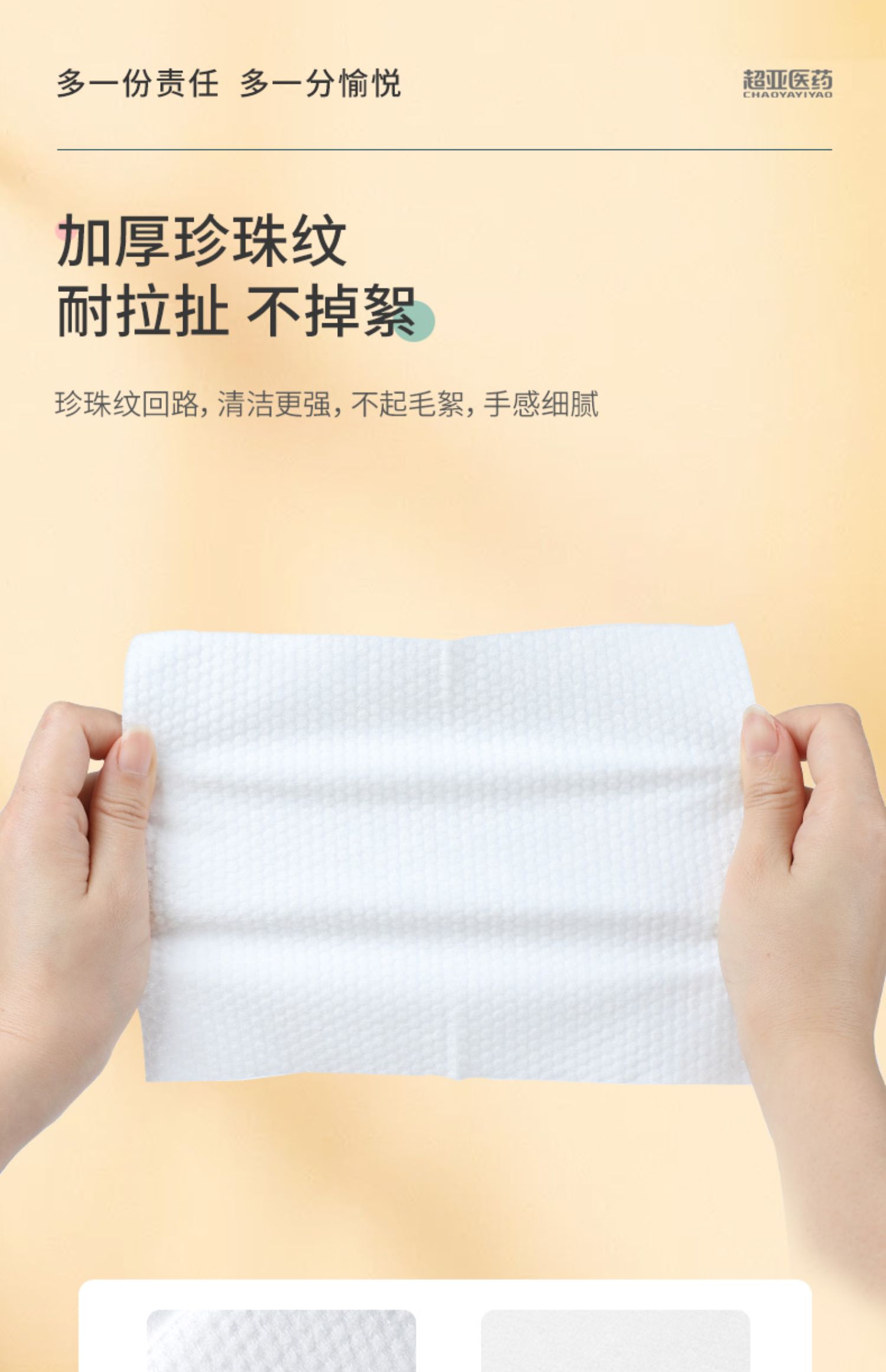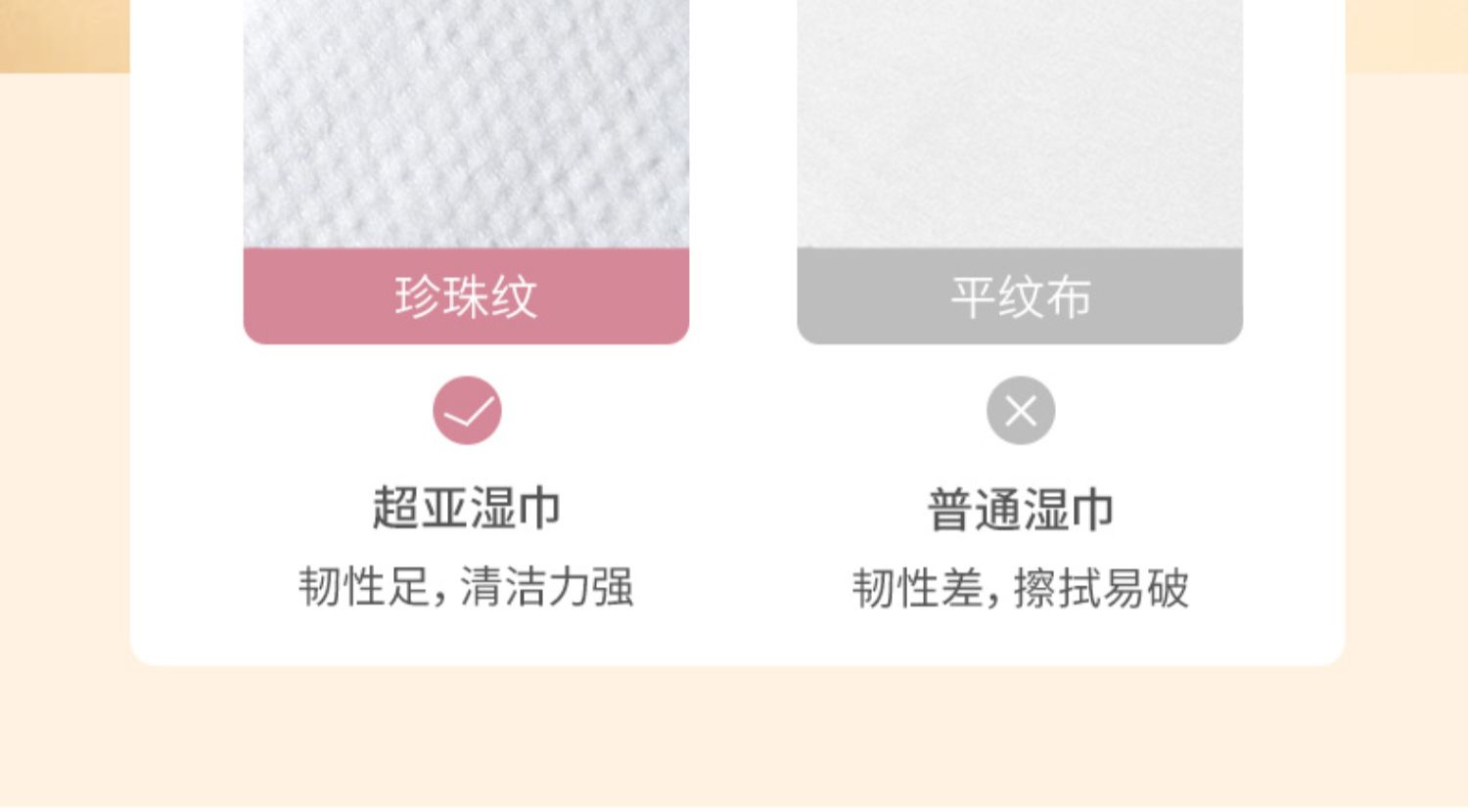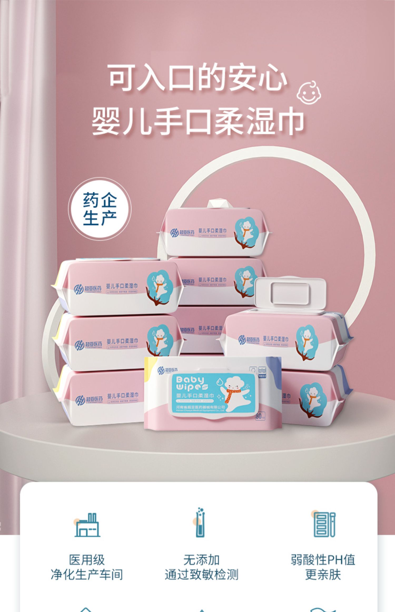 商品简介:超亚手口湿巾,无敏配方,严格高标准,7大无添加,珍珠设计,加倍清洁,10万级净化车间,全自动生产,承诺安全放心!