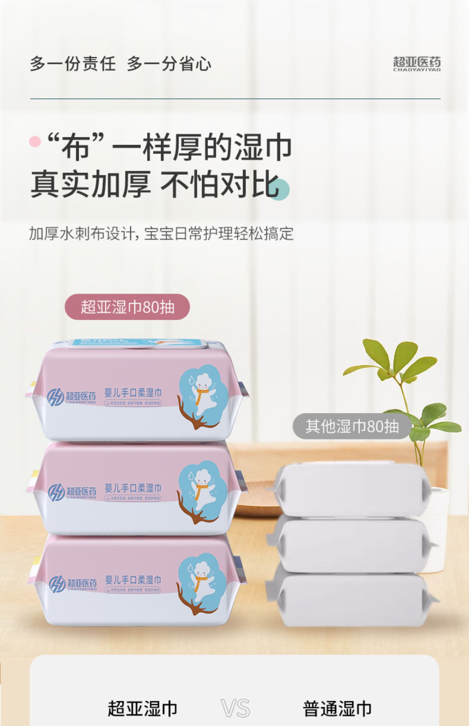 商品介绍:超亚婴儿湿巾加宽加厚80抽*5包