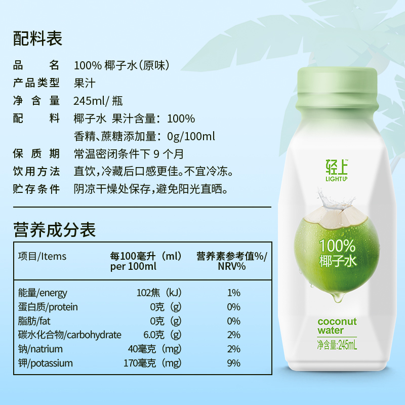 商品名称:【轻上官方正品】椰子水可喝泰国进口纯椰子椰子汁245ml瓶LQ
