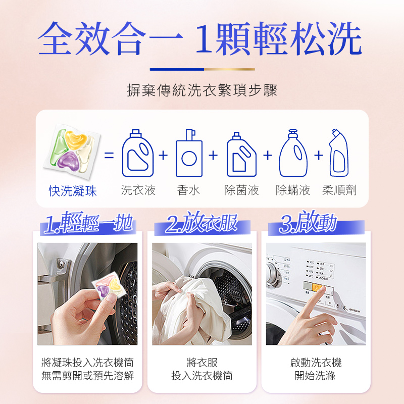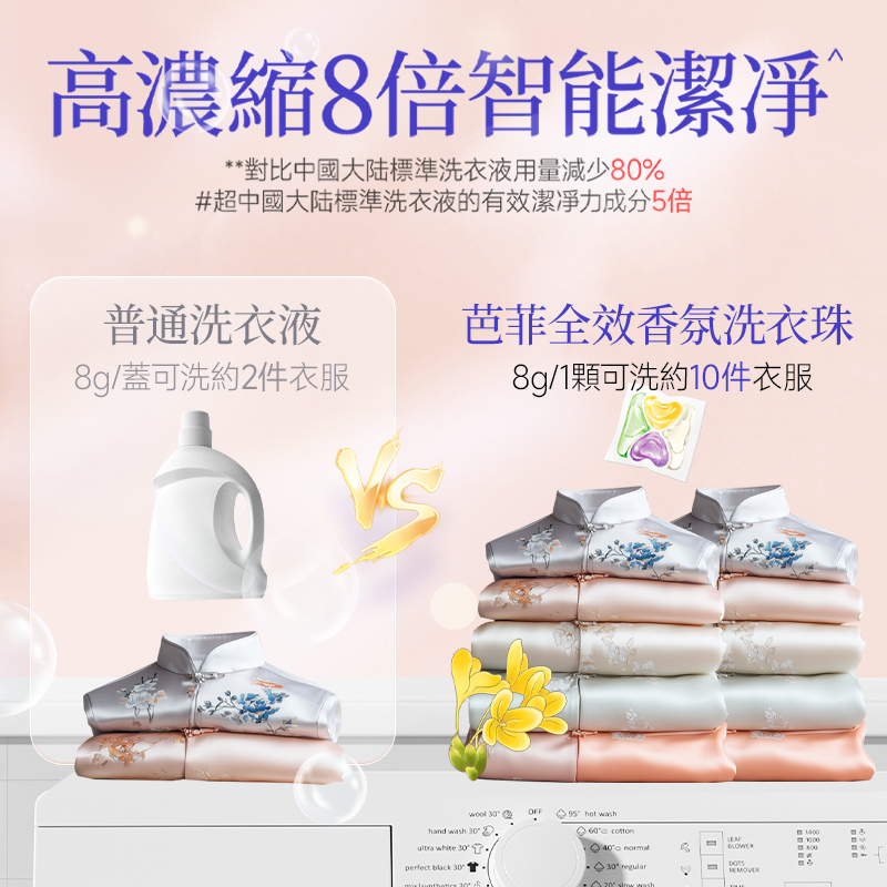 商品简介:芭菲全效香氛快凝珠,香味持久留香除螨除菌很轻松,8倍浓缩溶速加快35%,5重奢护留香不留菌,亲肤呵护~,令衣物持久洁净卫生。温和不伤手,强力去污不伤衣~