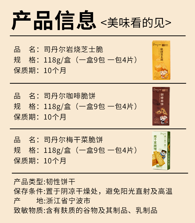 商品简介:司丹尔知名烘焙老品牌,近百家线下高端糕点门店口碑很好,还是“国内知名国饼十佳名优品牌”,线下门店经常卖断货,一盒9小包,每包4片!2.5mm的胚体+真芝士含量,真爱了~