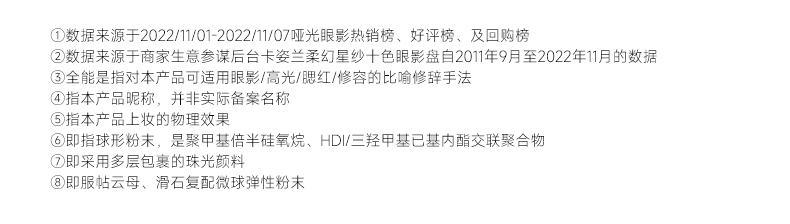 商品简介:【先入会再加赠有色唇部精华1g】茶叶提取物,控油持妆,哑光,微闪,星钻3种质地,显色顺滑,双头笔刷,精致上妆,百变妆效,花影眼妆!让你瞬间变女王!