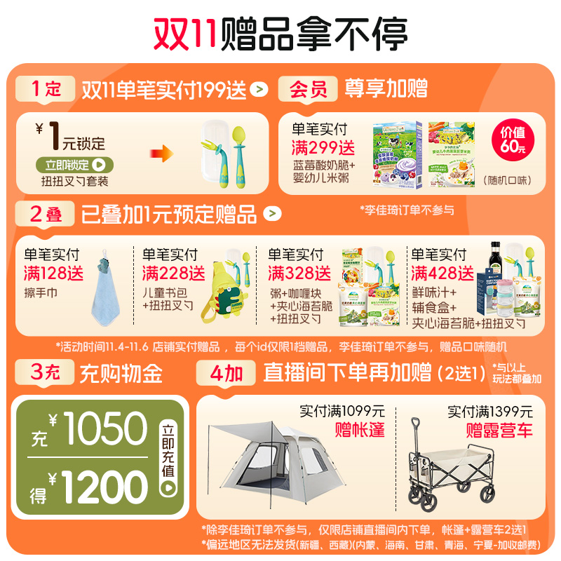 商品简介:买6送果泥+50g面*1、多种组合可选全谷物制作,不甜不腻,非油炸,好吃不脏手,温和接触牙床,快速吸收口水,多口味只为满足孩子的喜好!【赠运费险】