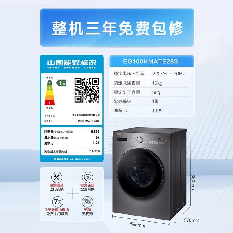 商品介绍:海尔滚筒洗衣机全自动10kg除菌洗烘MATE28