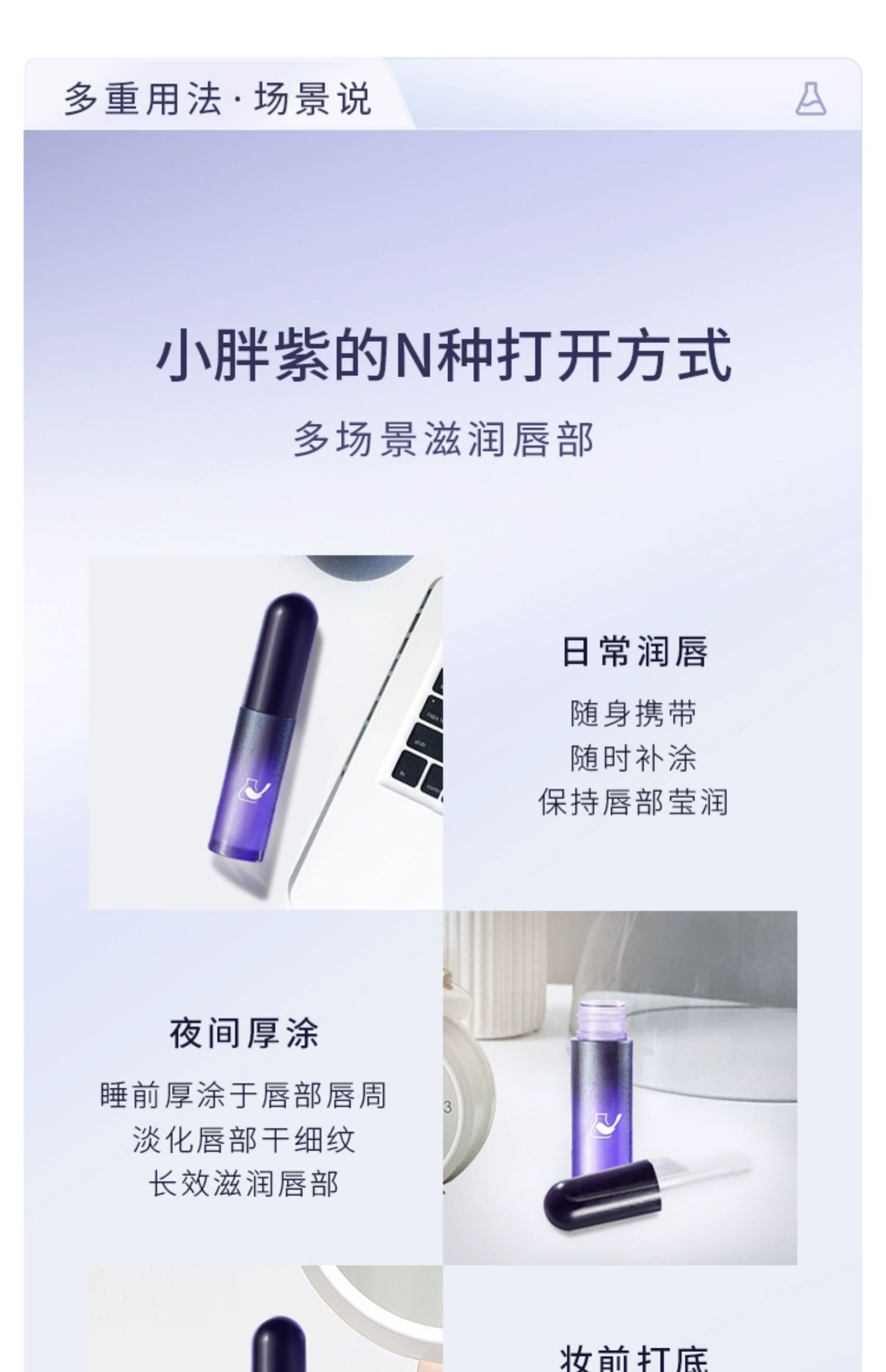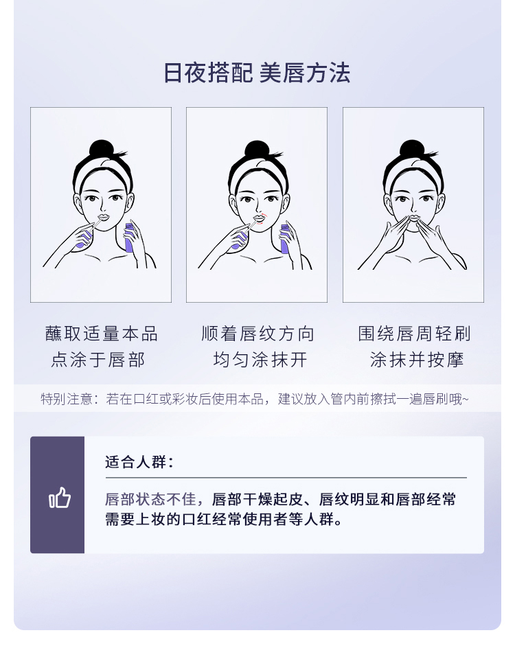 SPA级精华,8小时持久保湿!缓解唇部干裂,彻夜守护娇嫩双唇,水润轻盈不油腻,淡化唇纹,深层滋润唇部,抹出3D啵啵唇
