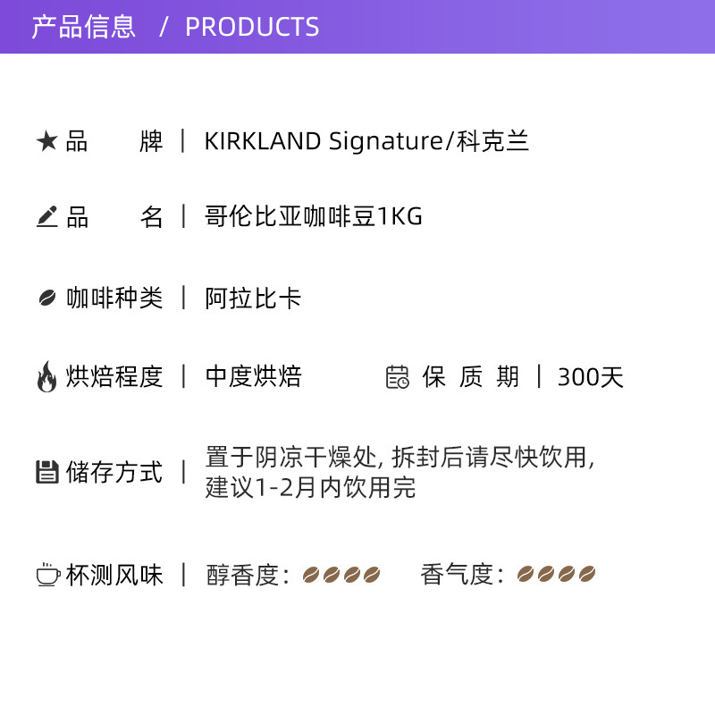 商品介绍:柯克兰哥伦比亚中度烘焙咖啡豆1.36kg