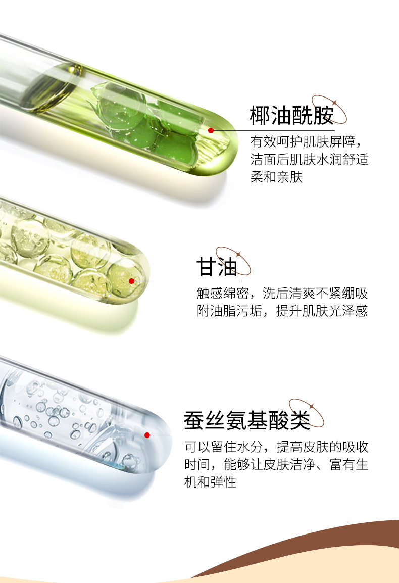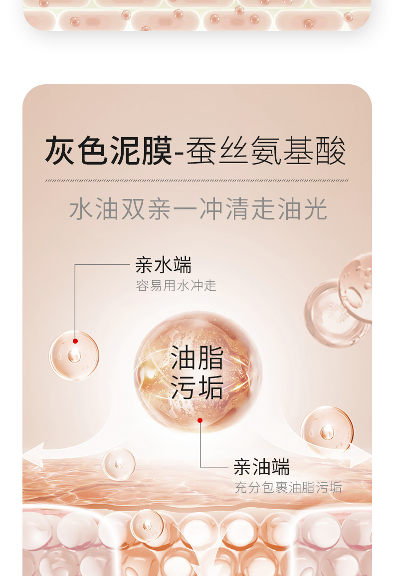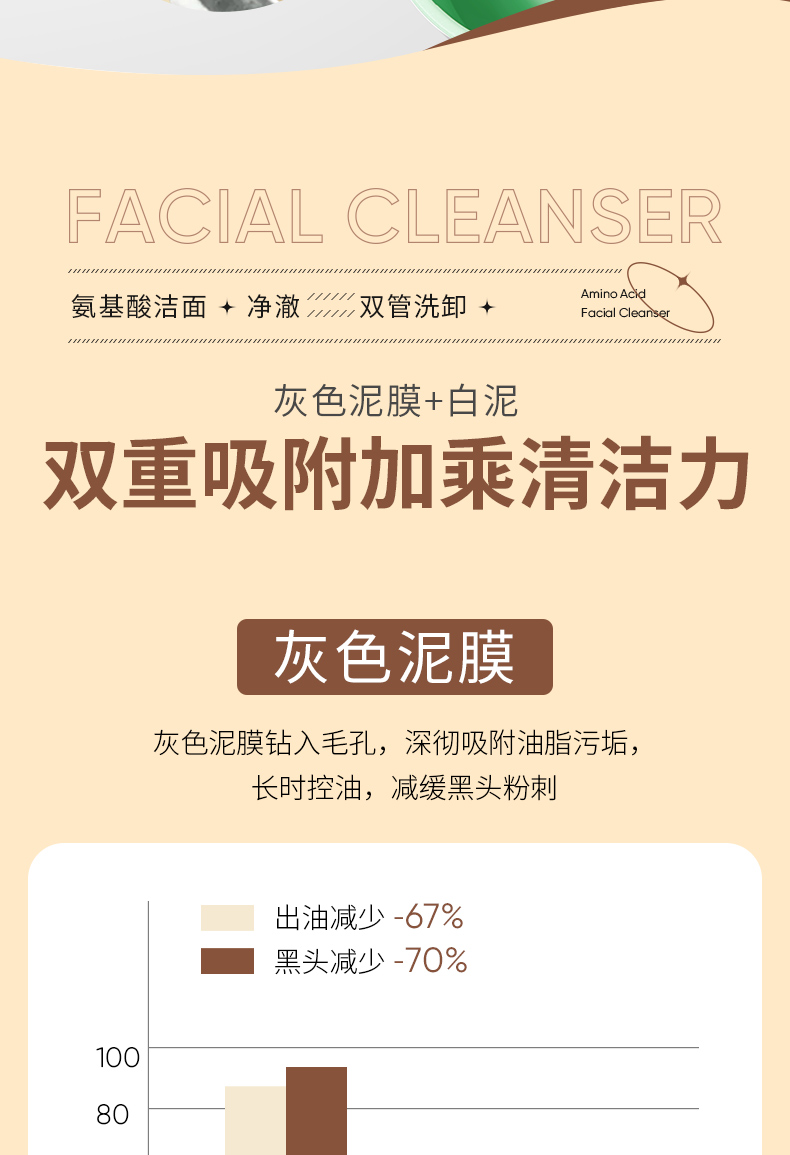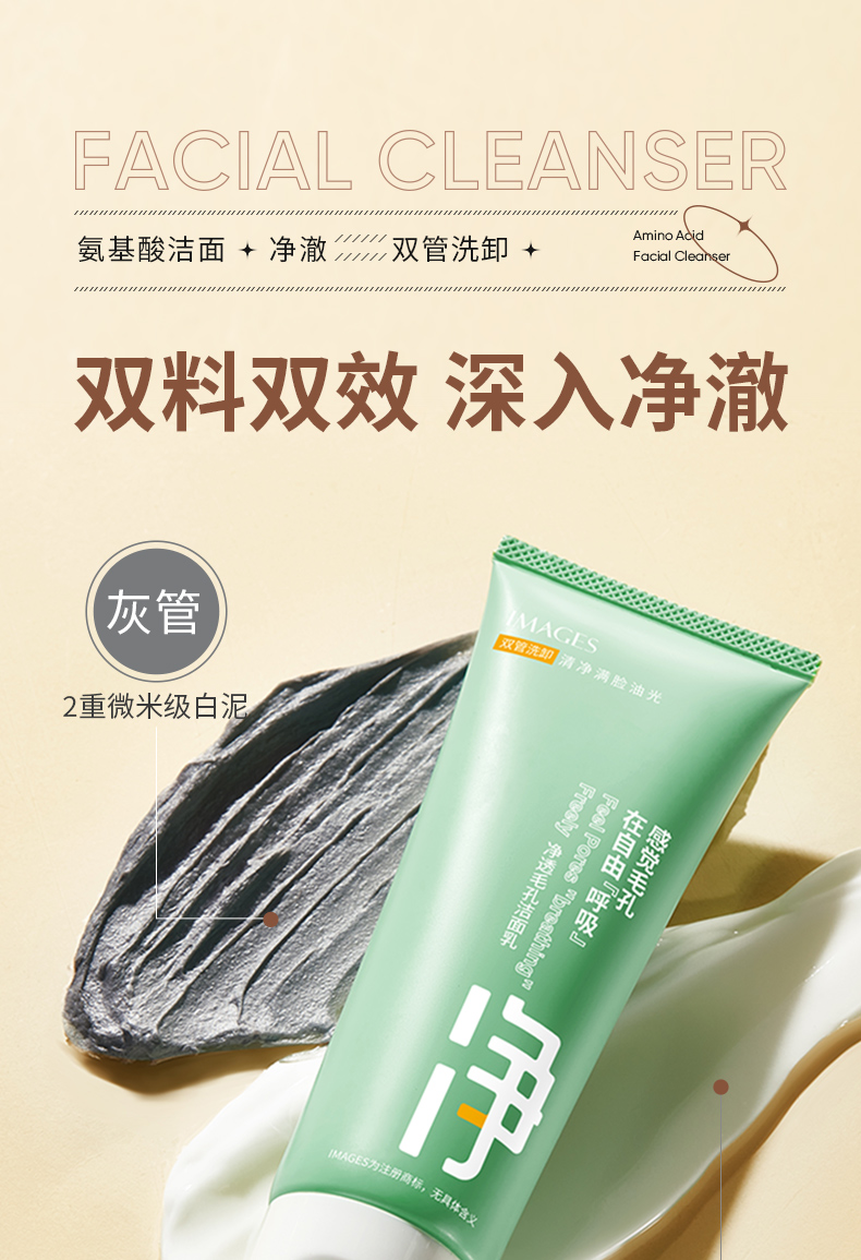 商品简介:双料双效,深入净澈,2重微米级白泥,4重氨基酸表活,绵密泡沫柔和净澈,突破传统洁面乳的样子,水油双亲,一冲清走油光,深层净澈弹润嫩滑,复配保湿成分,舒润洗净无负担。