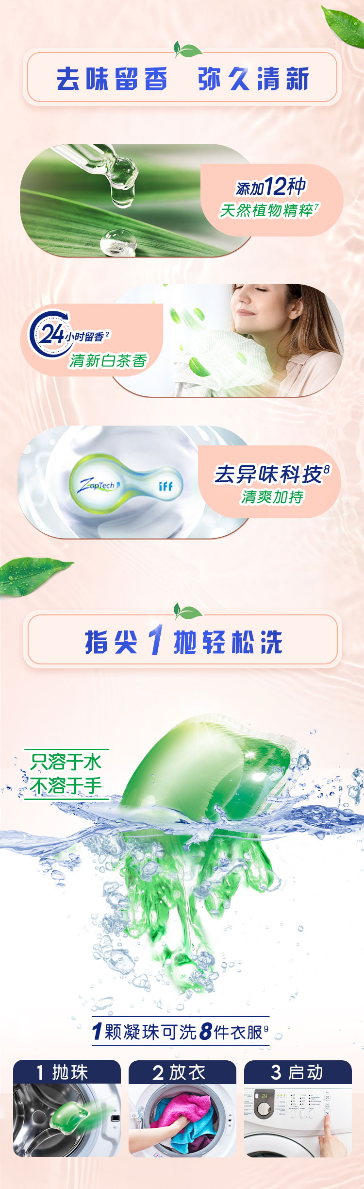 商品简介:奥妙自然工坊白茶除菌洗衣凝珠,持久留香,酵素洁净,8倍浓缩洁净力,除菌除螨,清新白茶香,持久留香!