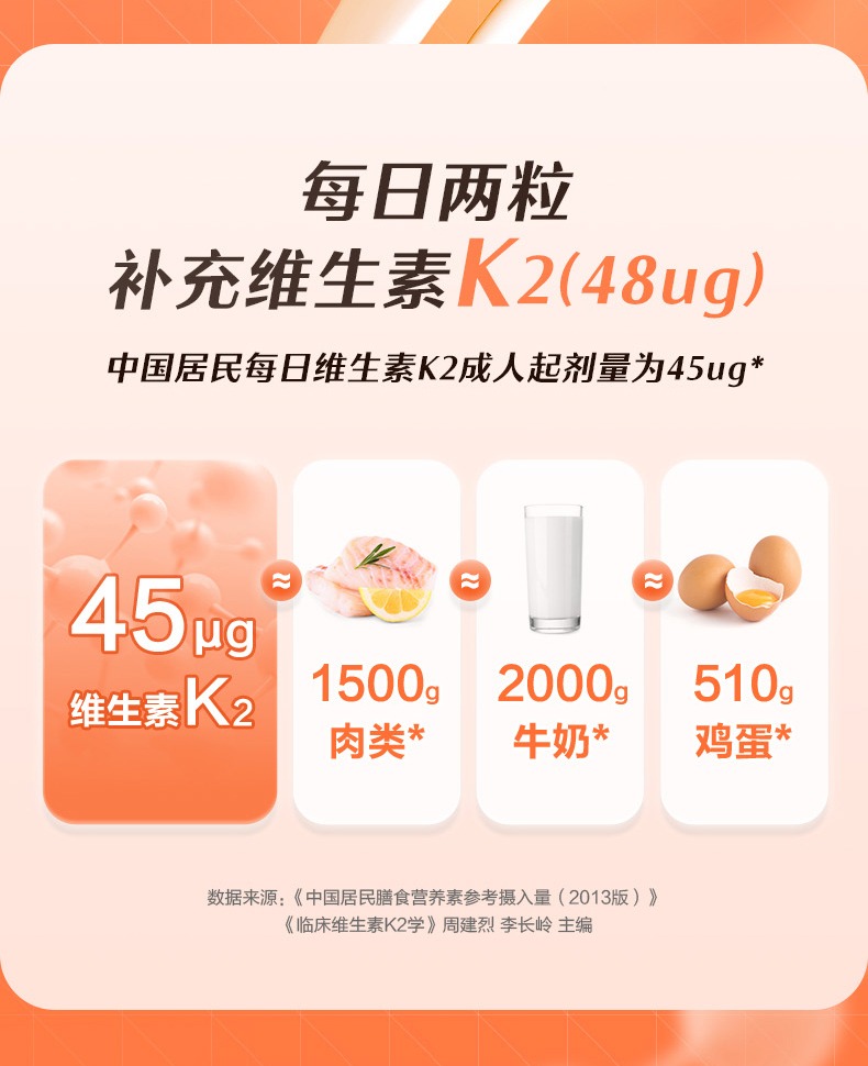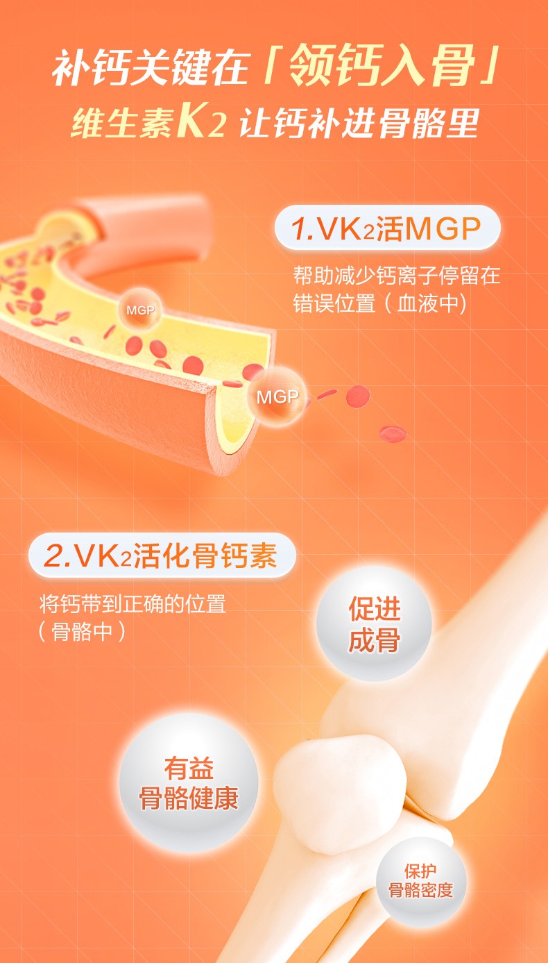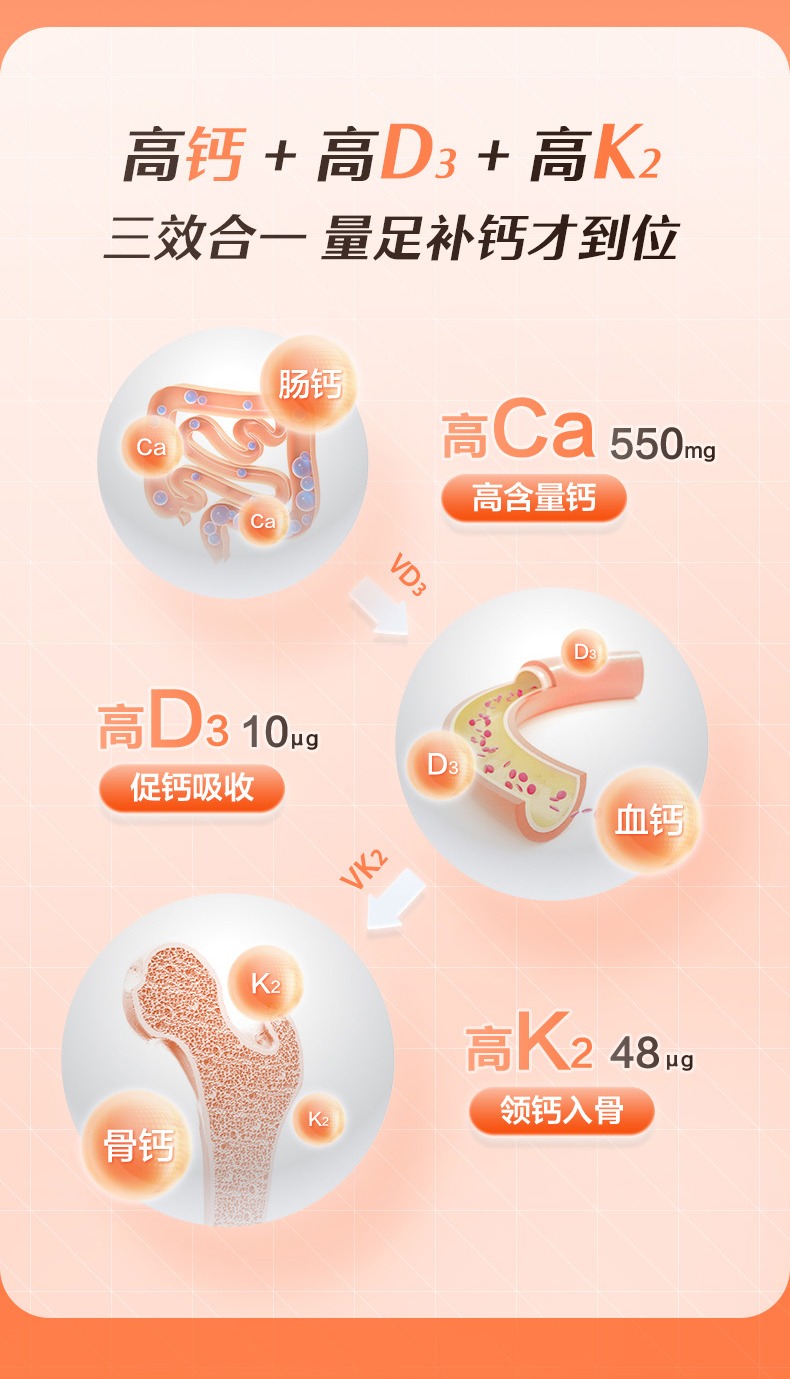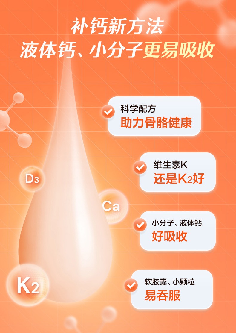 商品简介:补钙关键在「领钙入骨」维生素K2让钙补进骨骼里,液体钙、小分子更易吸收,高钙+高D3+高K2三效合-量足补钙一步到位!