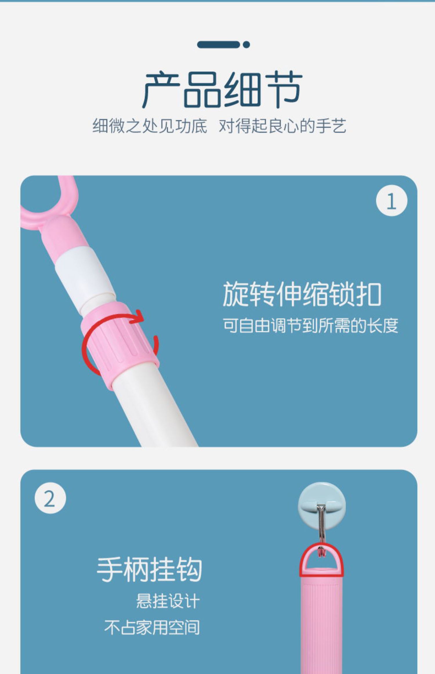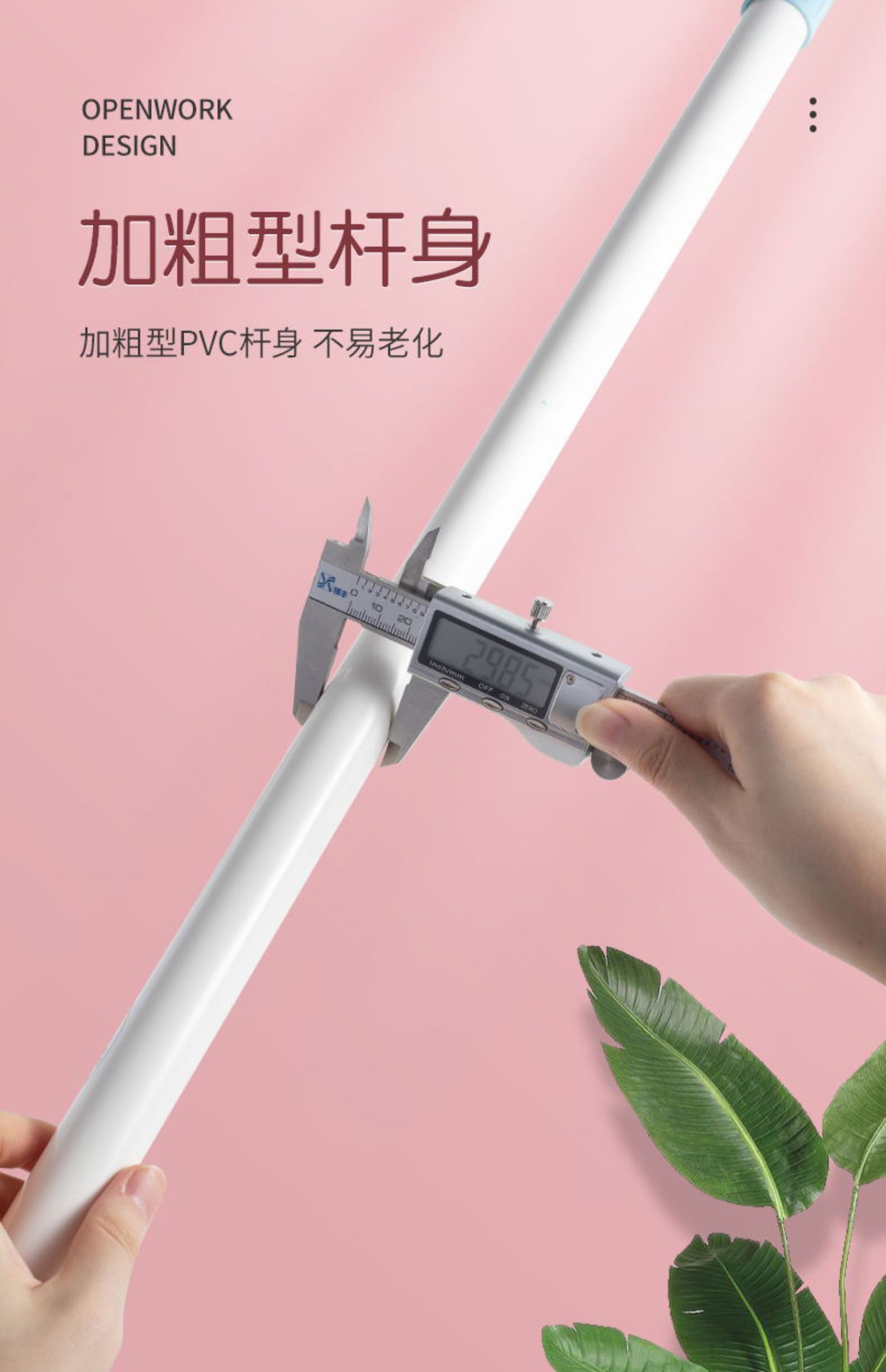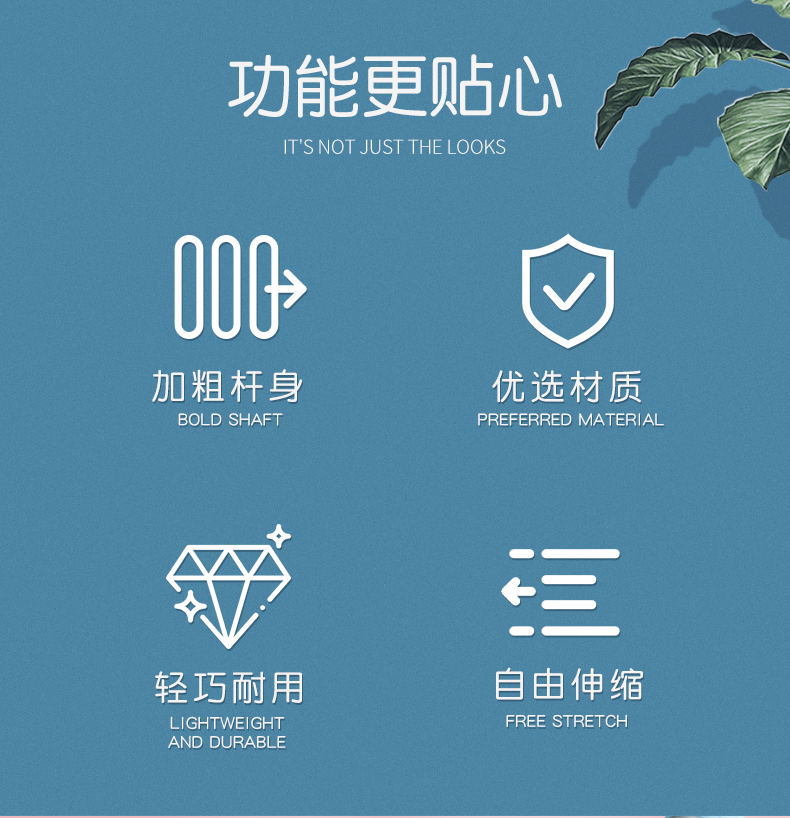 商品简介:加粗型PVC杆身不易老化,严选材质经久耐用,锁扣优选PP材质反复使用不易开裂!采用塑料材质小巧轻便,自由调节长度缩短86CM伸长131CM!
