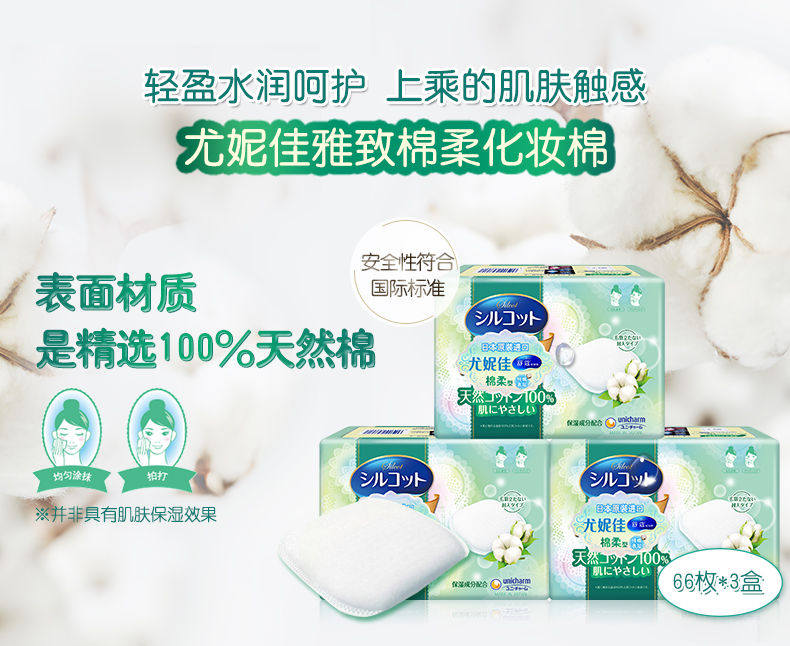 商品名称:尤妮佳舒蔻化妆棉 雅致纯棉呵护敏感肌卸妆洁面 66片*3盒