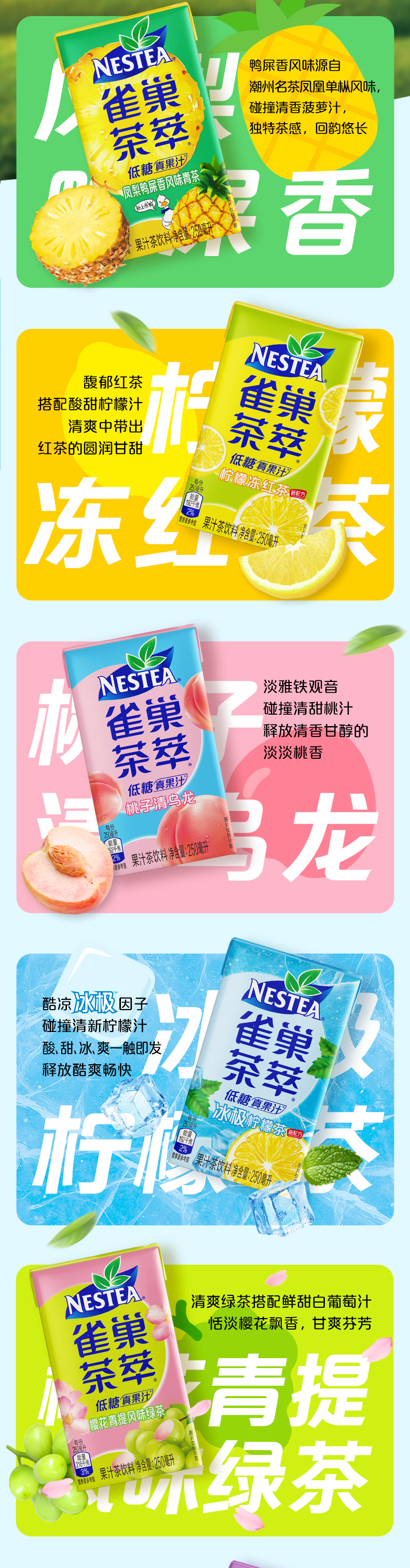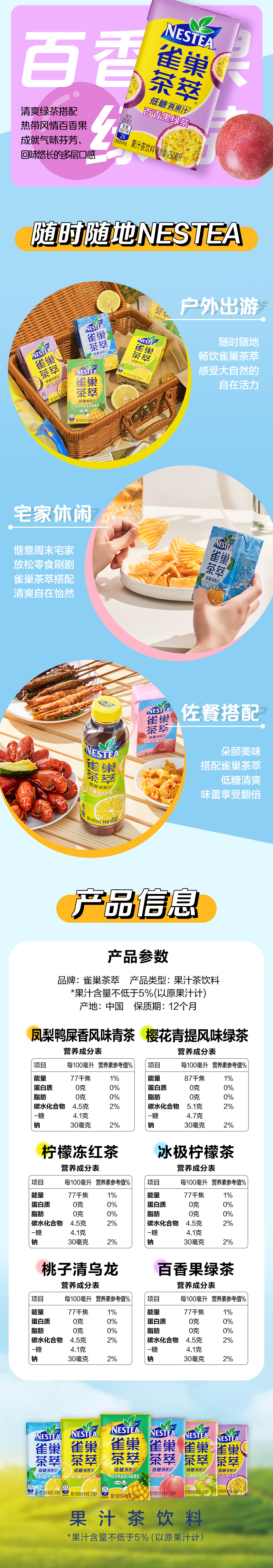 商品简介:【下单减10元】Nestle/雀巢茶萃樱花青提风味绿茶果汁茶饮料250ml*24包。
