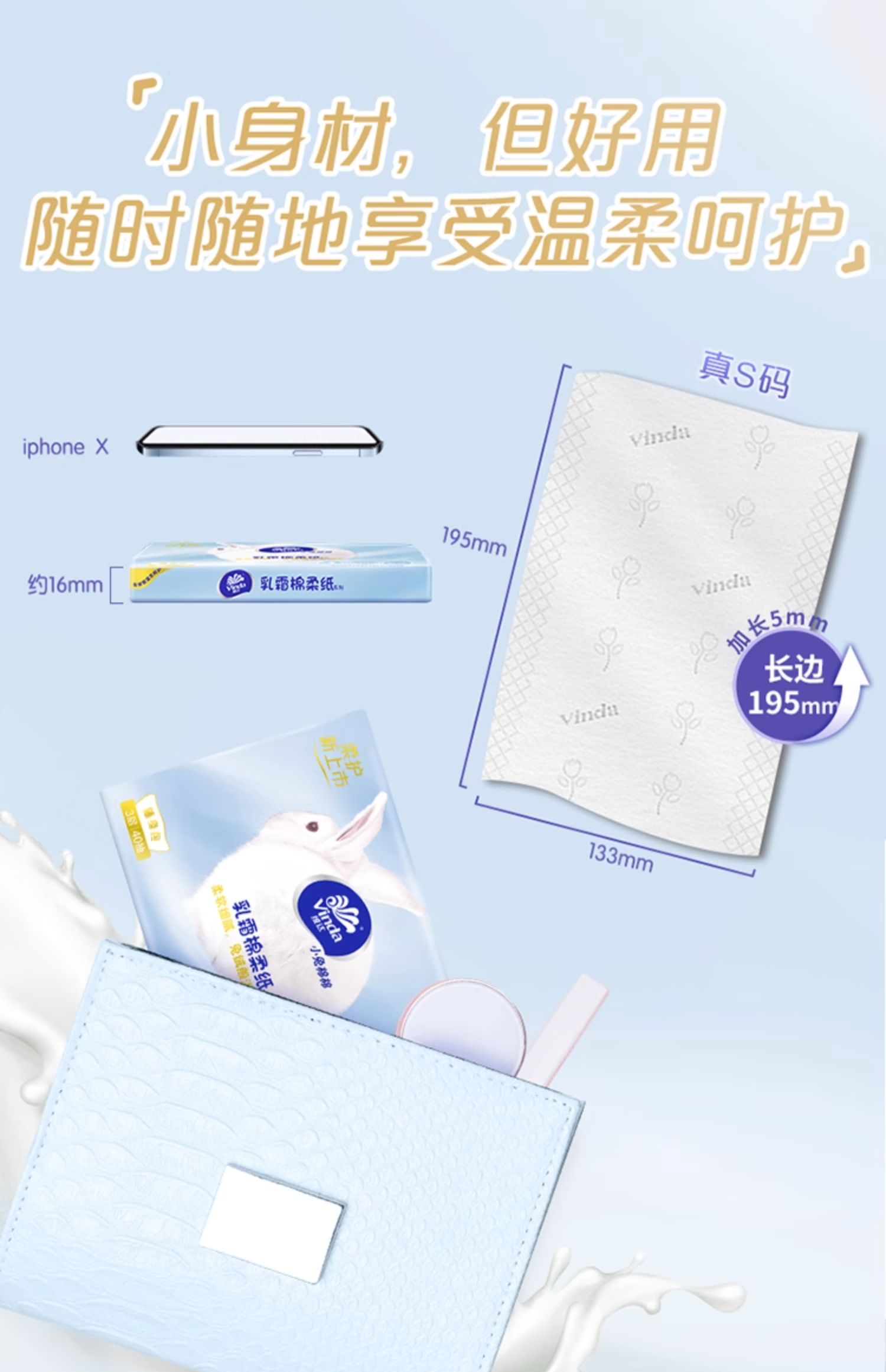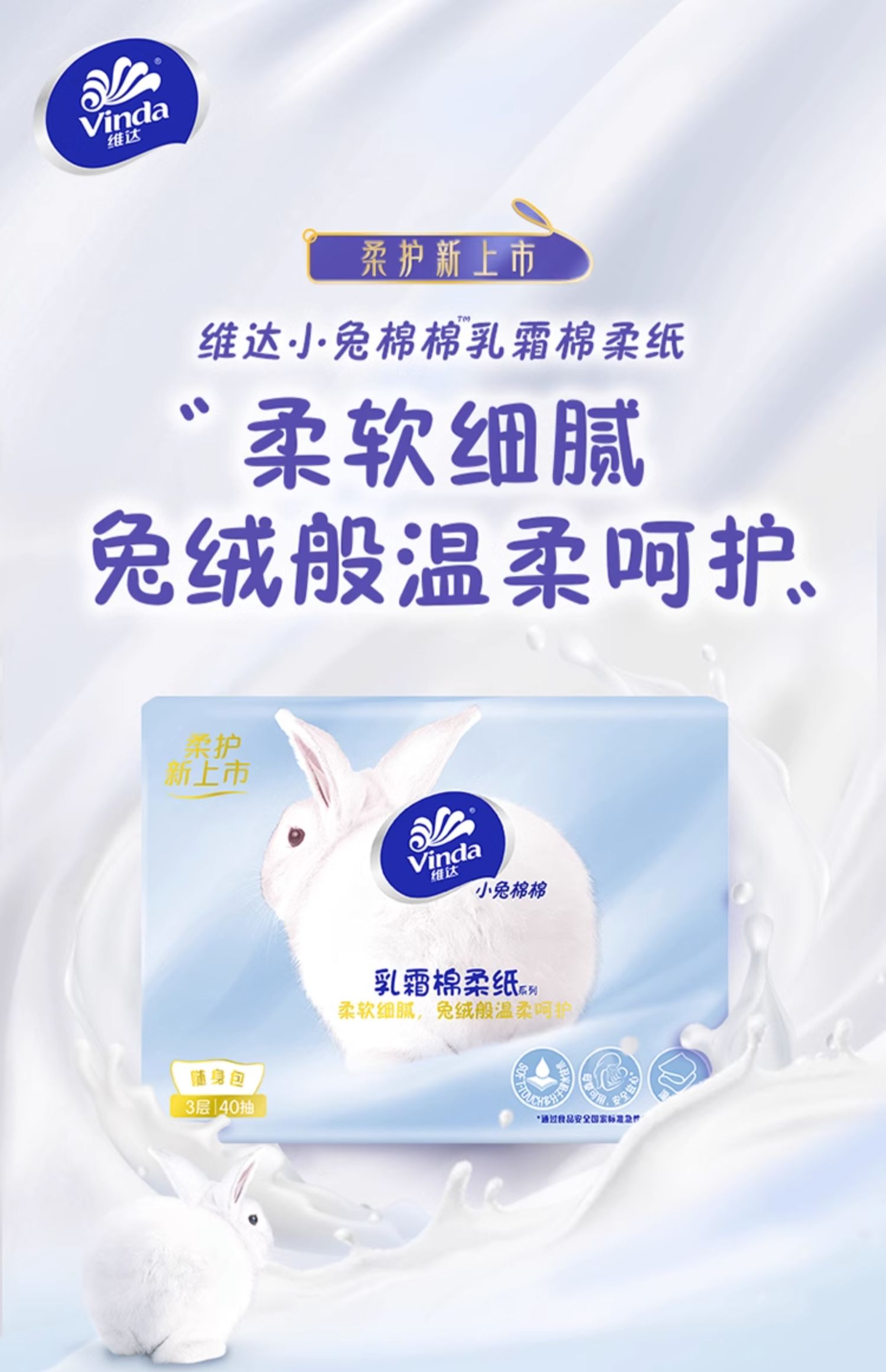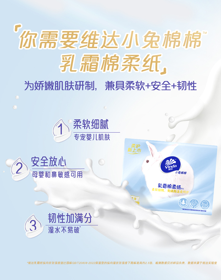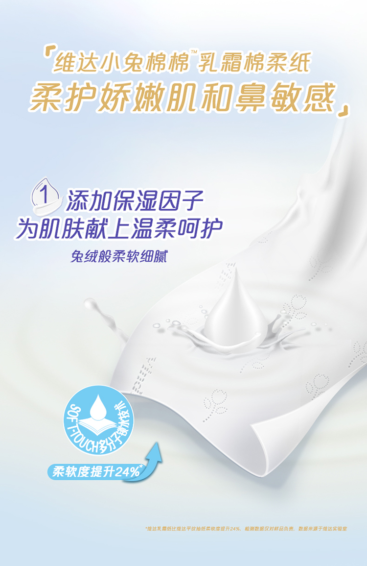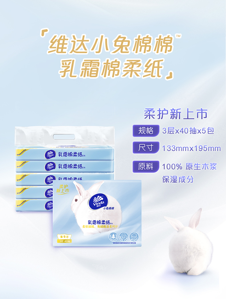 商品简介:【补贴到手15.3】维达小兔棉棉乳霜棉柔纸,柔软细腻,兔绒般温柔呵护!为娇嫩肌肤研制,兼具柔软+安全+韧性~