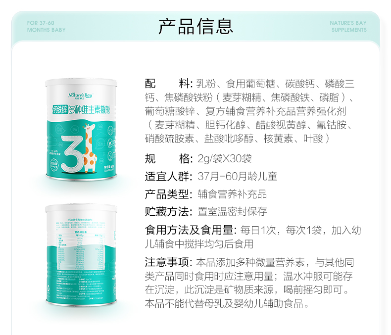 商品介绍:凑单105!天然博士1-12岁钙铁锌30条