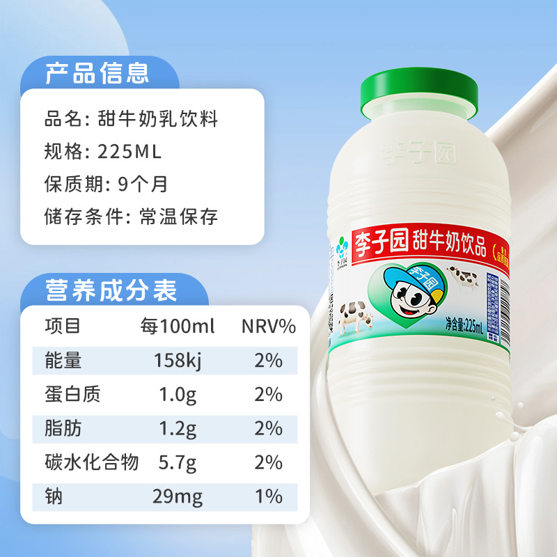 商品介绍:李子园原味甜牛奶225ml*20瓶*2箱