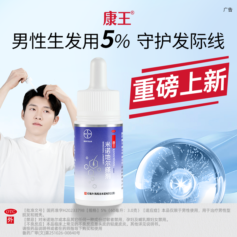 商品简介:【凑单101】丁香医生主推!康王米诺地尔搽剂,生发剂60ml一盒,针对于年轻发际线后移,发缝变宽群体,有限减少发量变少让你头发蓬松滑亮,拯救软塌头!