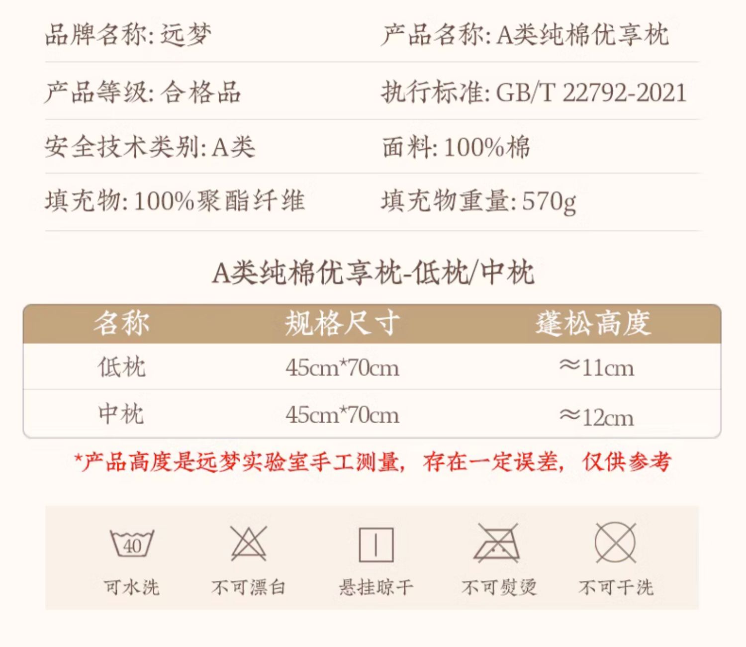 商品名称:远梦家居枕头儿童枕A类护颈枕学生宿舍可水洗家用低枕单枕芯成人