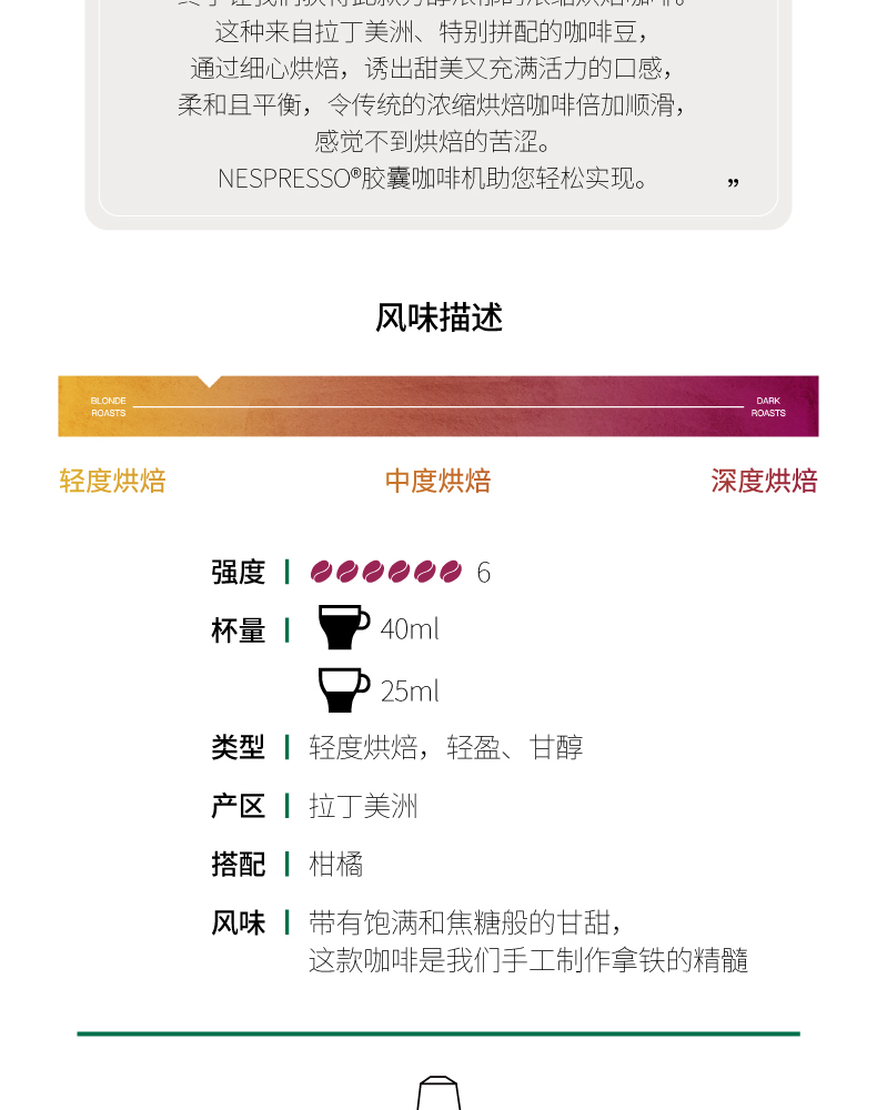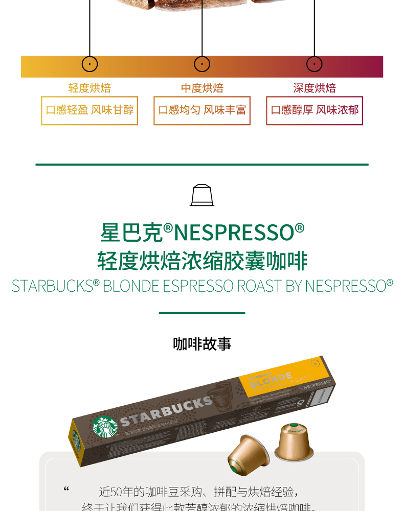 商品名称:【进口】星巴克Blonde轻度烘焙浓缩甘醇NESPRESSO胶囊咖啡53g*3盒