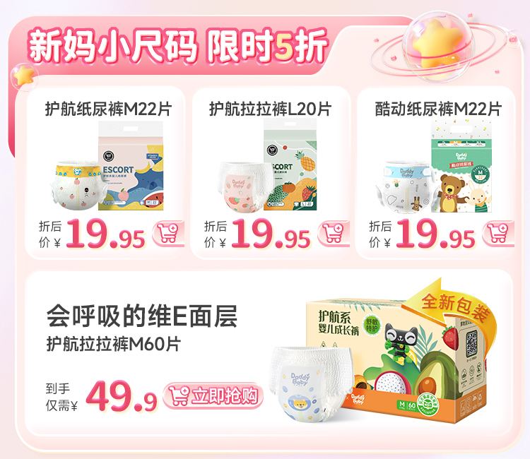 商品简介:拍4件99.9*4-75券-80立减-80品类券-5红包=159.6-72喵卡=87.6!!!这价位还要啥自行车,猫超!爹地宝贝维E弱酸护航纸尿裤,弹力环腰不变形,垂直导流能呼吸,透气干爽。