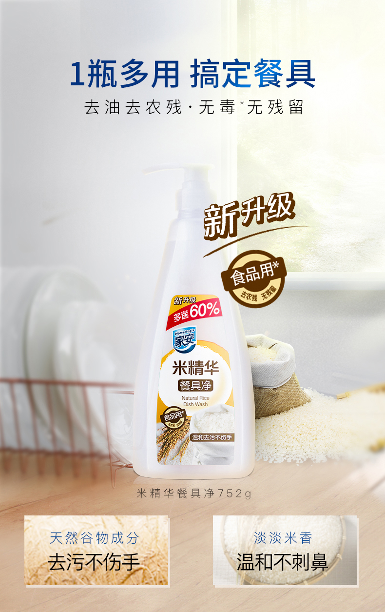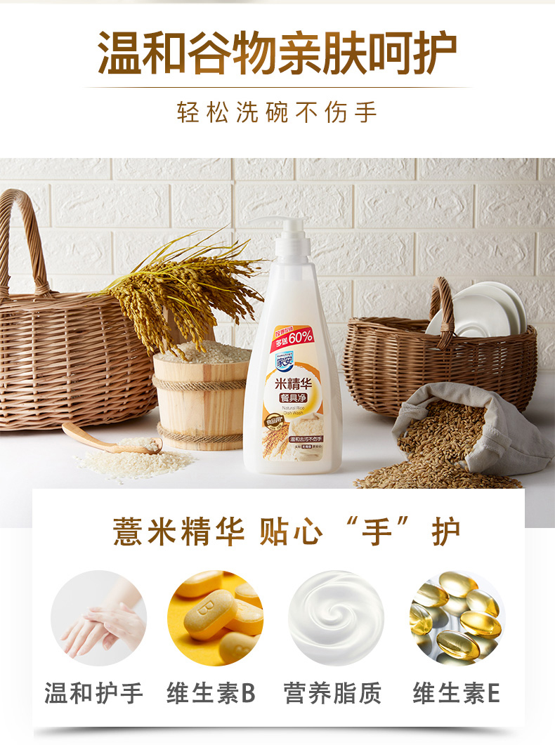商品简介:【立减40.3,到手37.6】家安洗洁精米精华752g*3,厨房清洁,温和不伤手,母婴用品,都可以用无残留,食品级别的用品