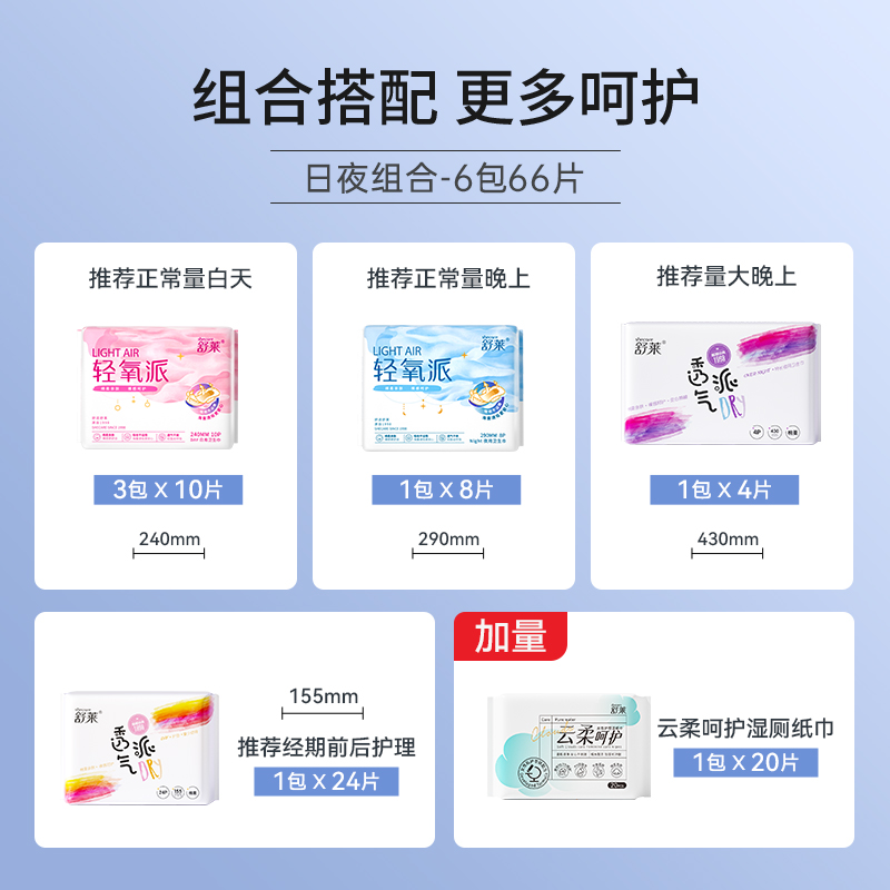 商品名称:包邮舒莱轻氧派卫生巾日夜组合6包66片加1包湿厕纸超薄透气干爽