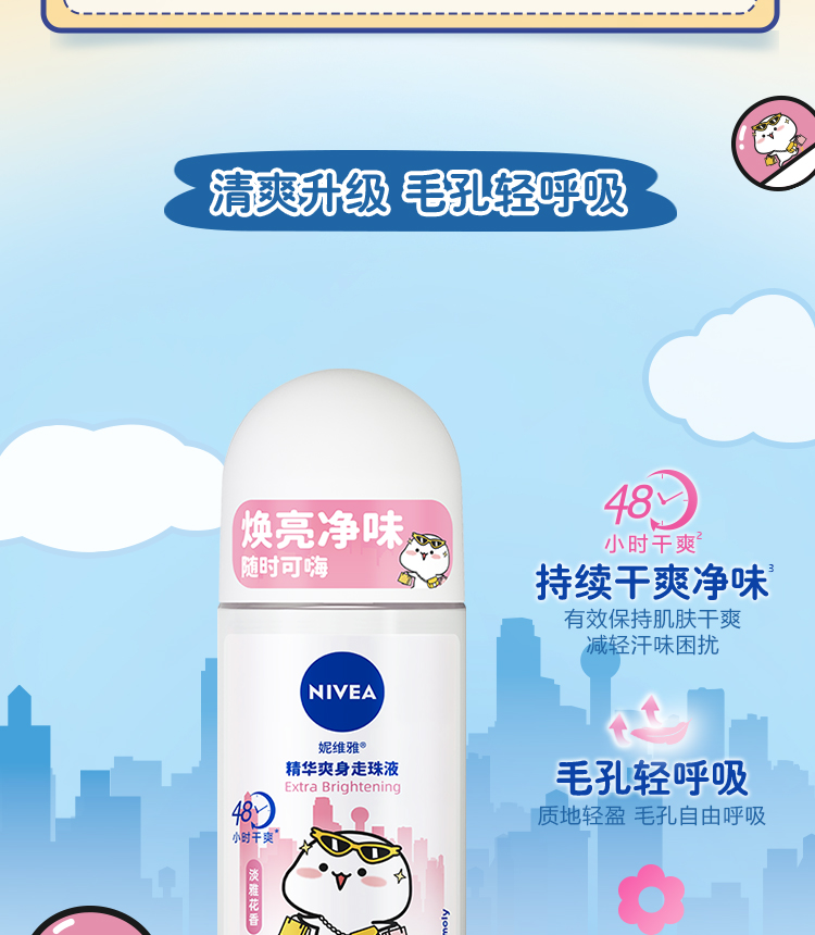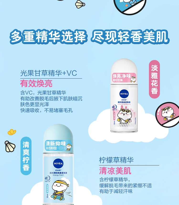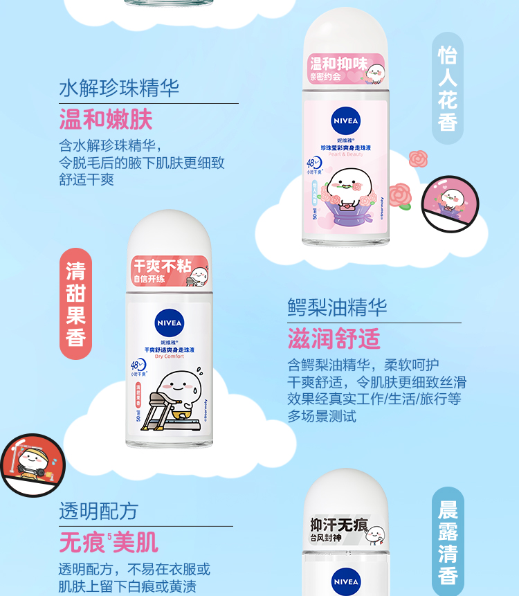 商品简介:妮维雅人气爆款单品,味道清雅淡香,持久抑汗,去除汗味,香体护肤,适合男女士任何肌肤,多种选择,持久爽身一整天!