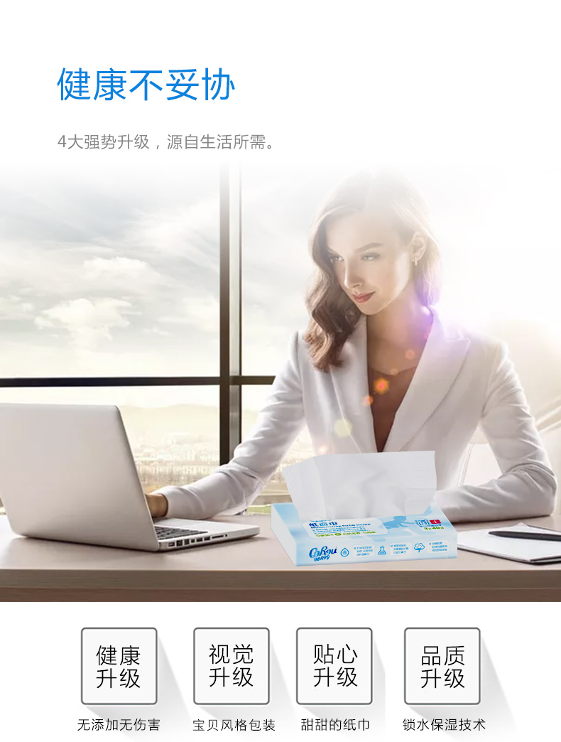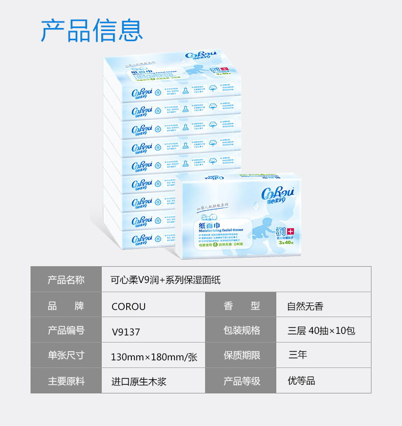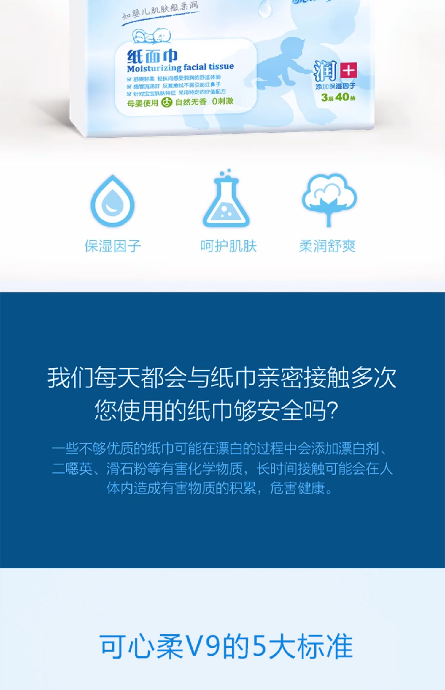 商品简介:可心柔抽取式纸面巾,进口保湿因子,锁水滋润!严选进口优质木浆,揉搓不掉毛絮,不添加荧光剂!可放心给宝宝擦手口,一纸多用,呵护全家!