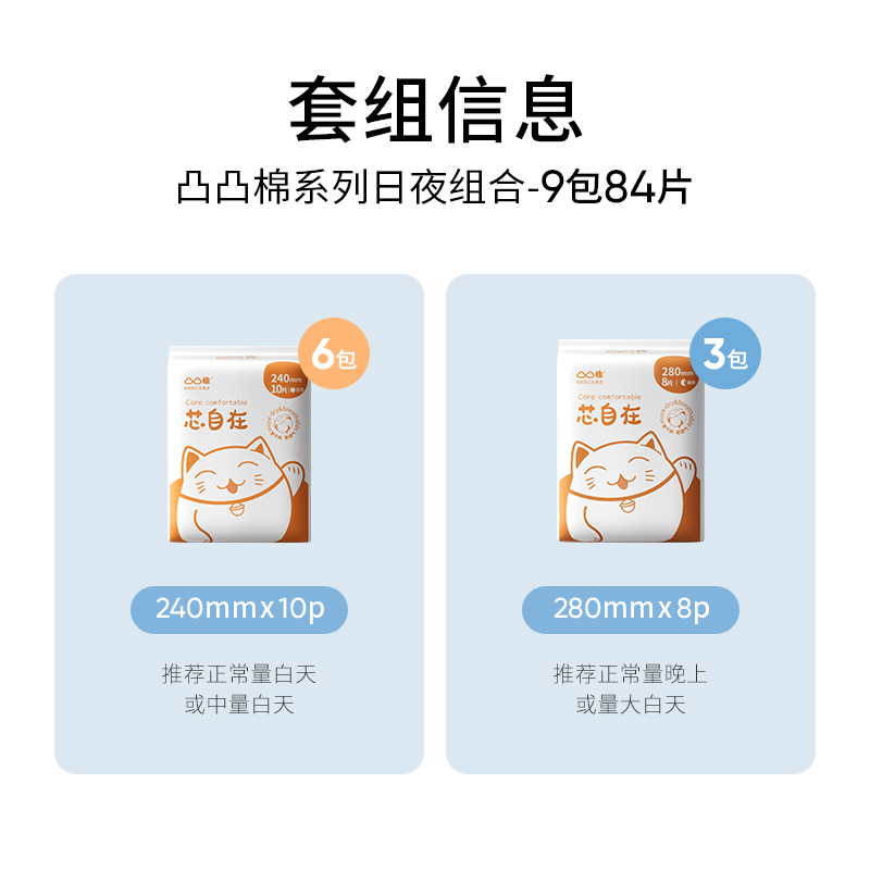 商品简介:到手9包104片,凸凸棉超薄日夜组合卫生巾,3D凹凸空气感面层,甩掉潮湿黏腻感,干爽会呼吸,通体全透气