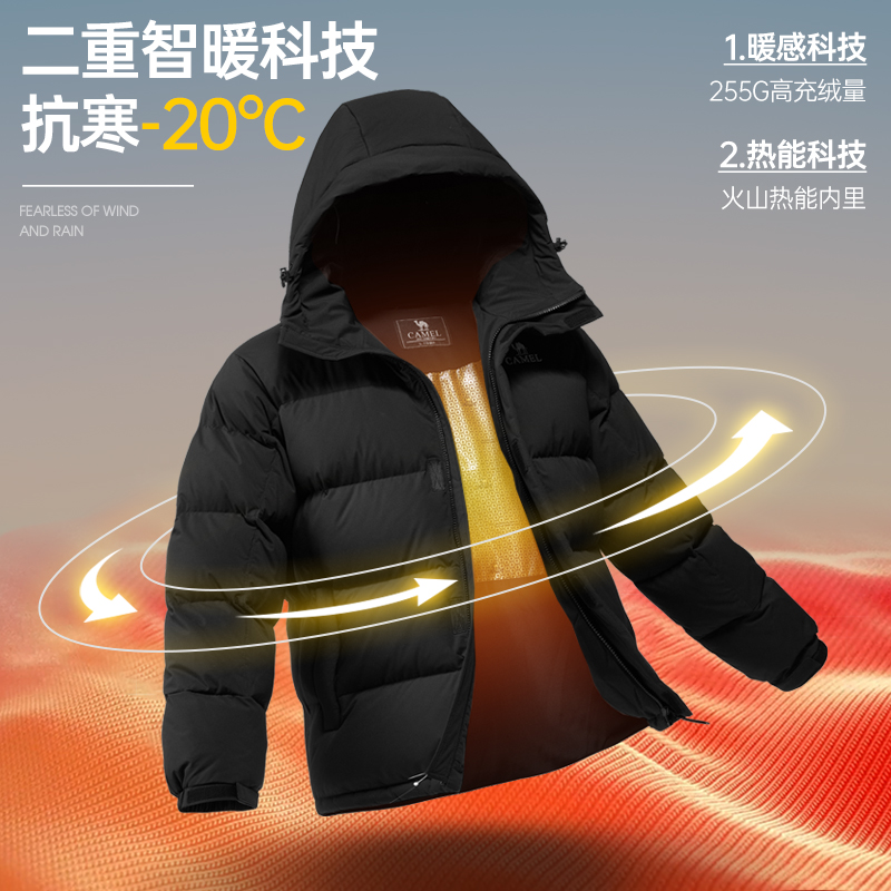 商品简介:骆驼火山科技防寒羽绒服男冬季,24反季极寒短款棉服加厚面包服外套