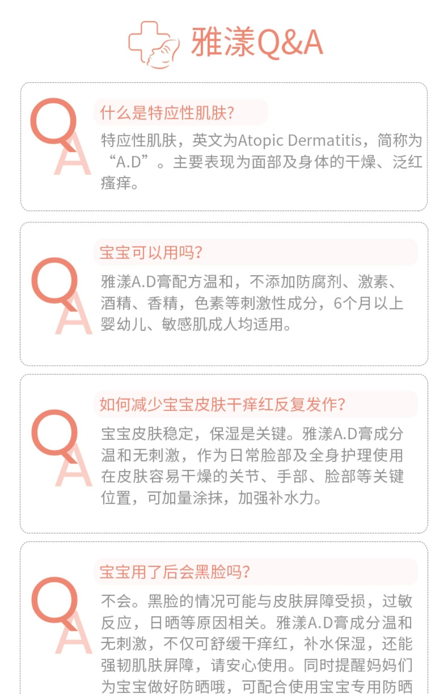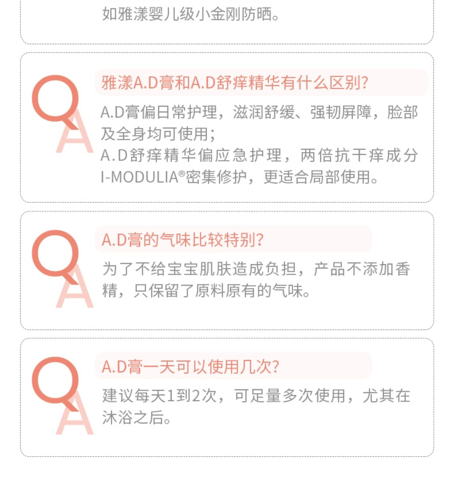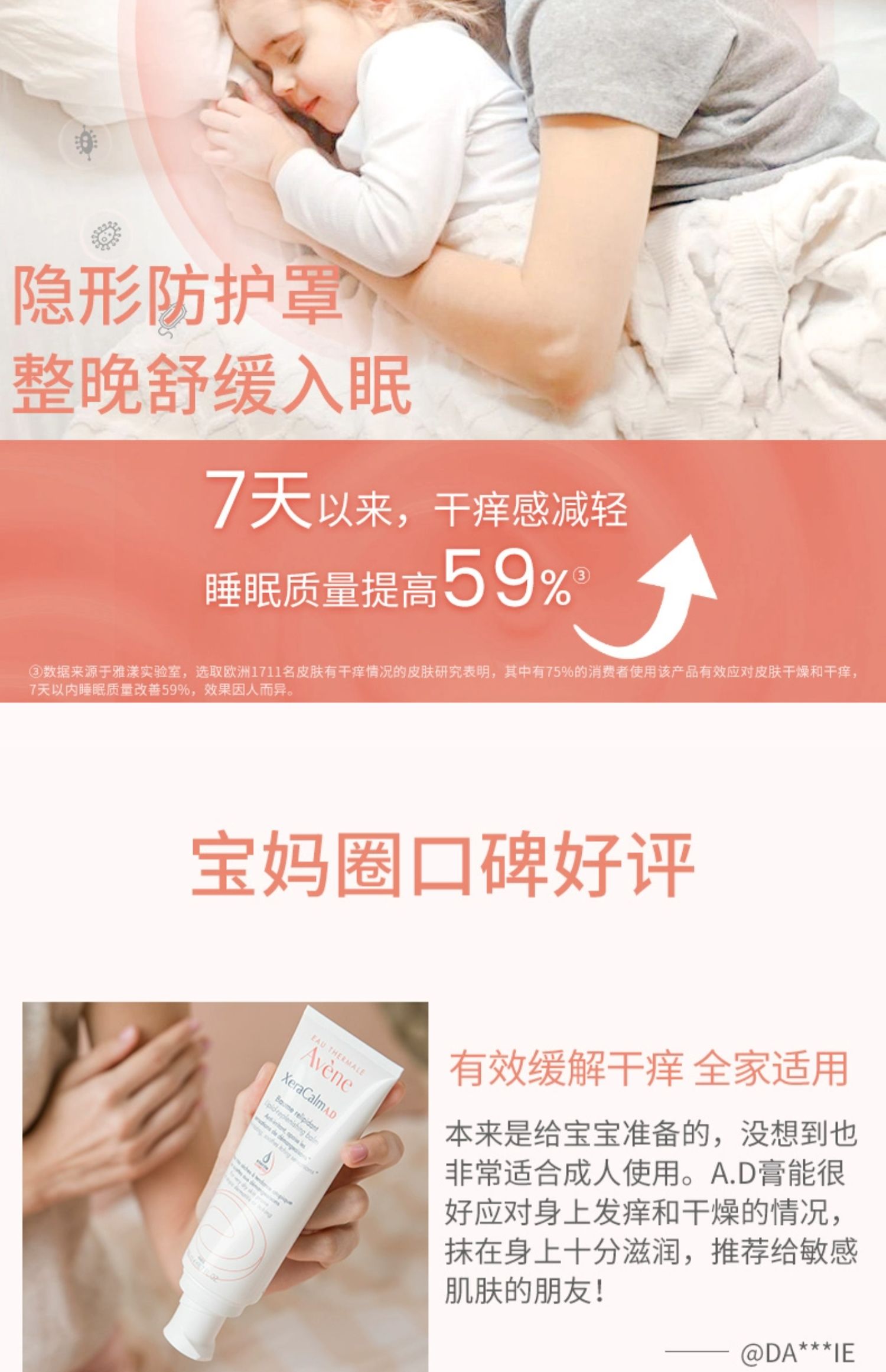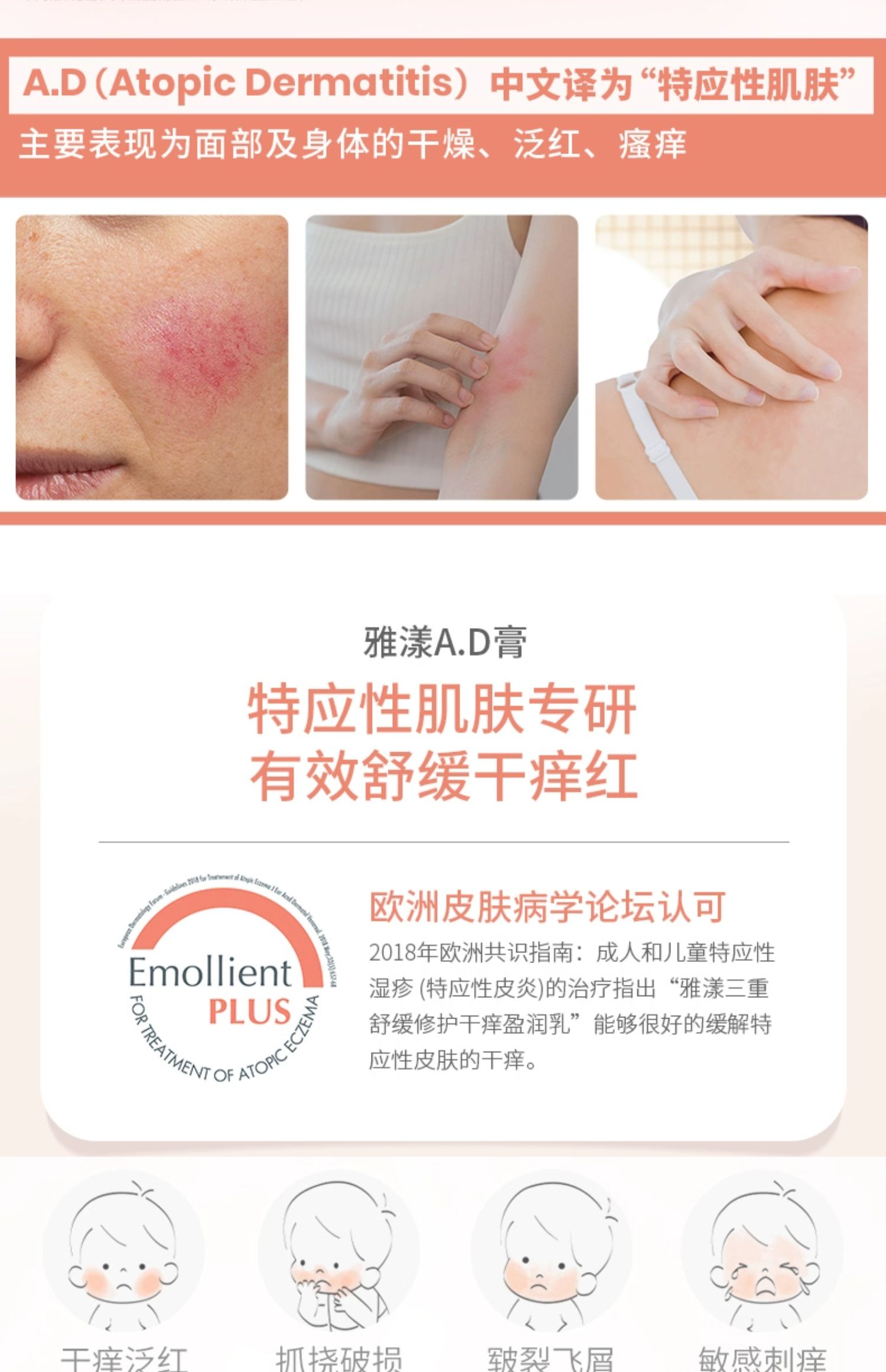 商品简介:雅漾AD膏,补水保湿,滋润舒缓,告别干痒,修复泛红肌,身体乳轻松修护,告别泛红肌!一抹盈润,全面滋润,打造水润美肌!使用简单,方便携带,随时随地保护肌肤!雅漾AD膏,你的肌肤守护神!