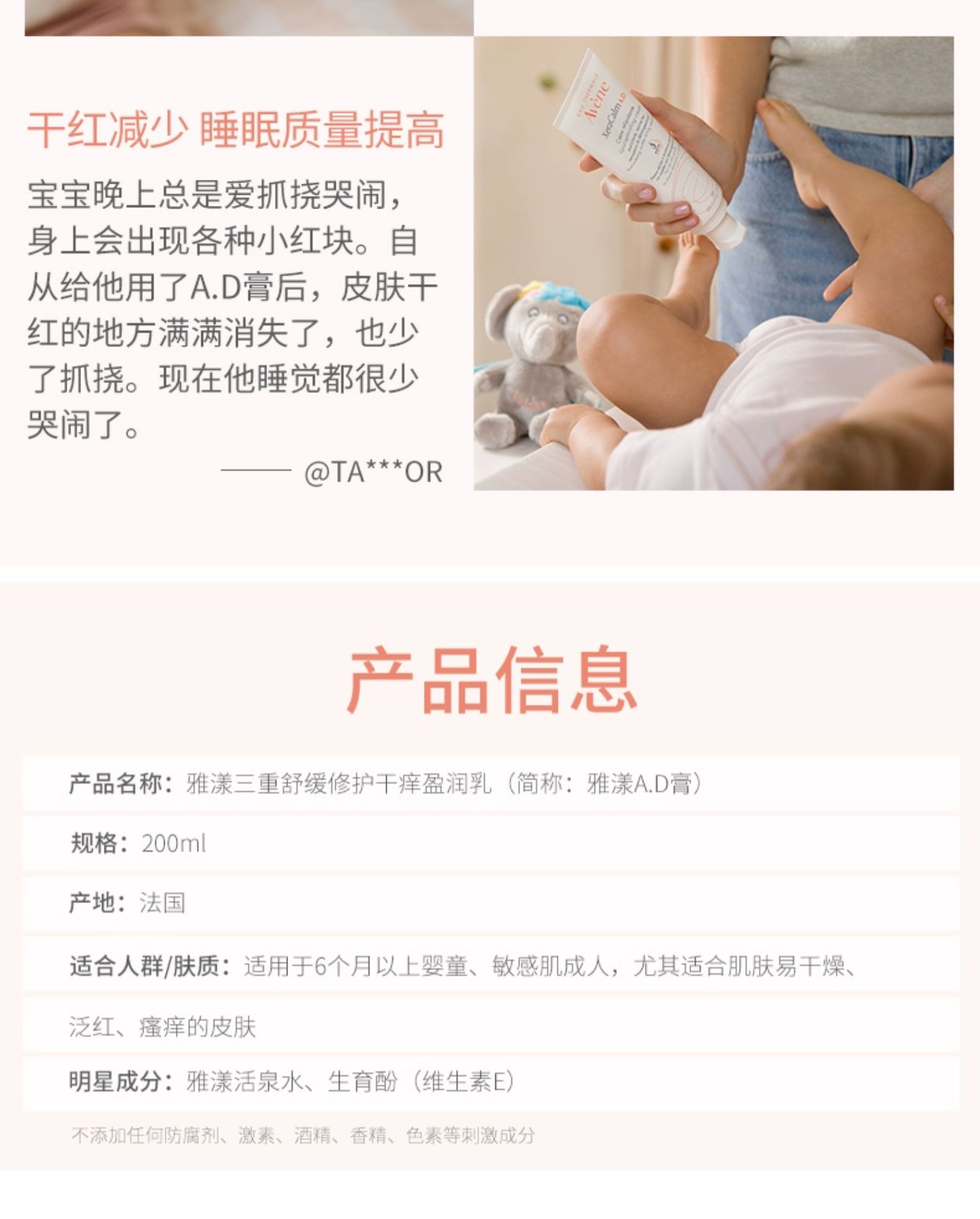 商品名称:【双11立即抢购】雅漾AD膏补水滋润舒缓干痒泛红肌身体乳200ml