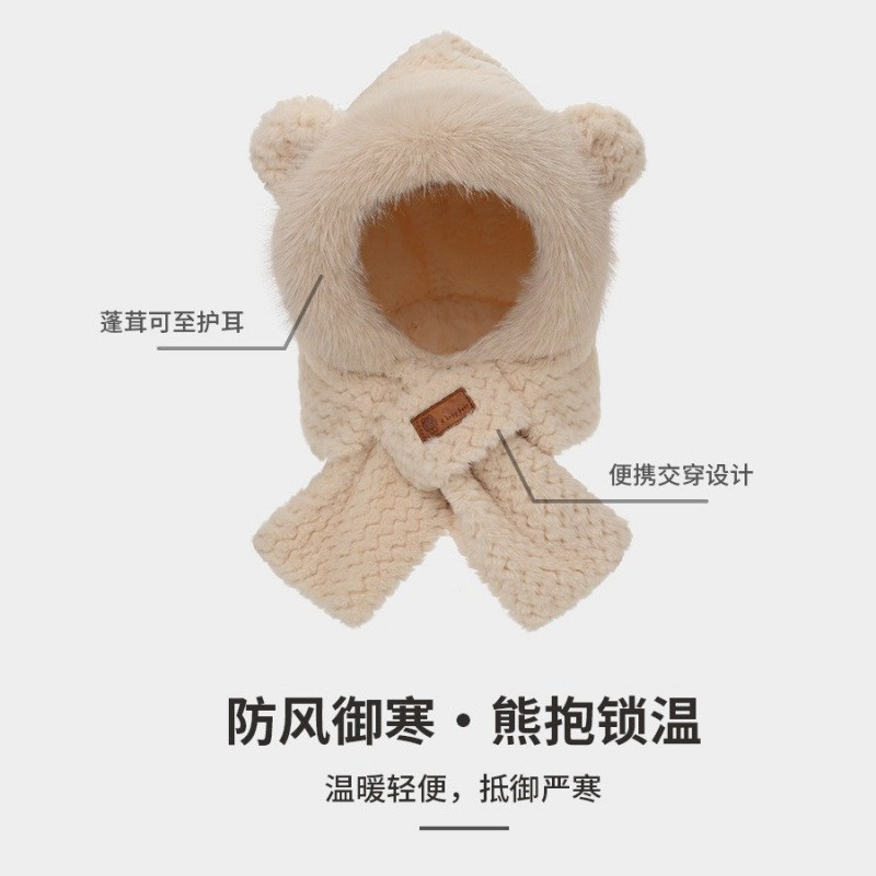商品名称:狐狸耳朵帽子女款2024新款秋冬季时尚围巾围脖保暖女毛毛绒一体帽