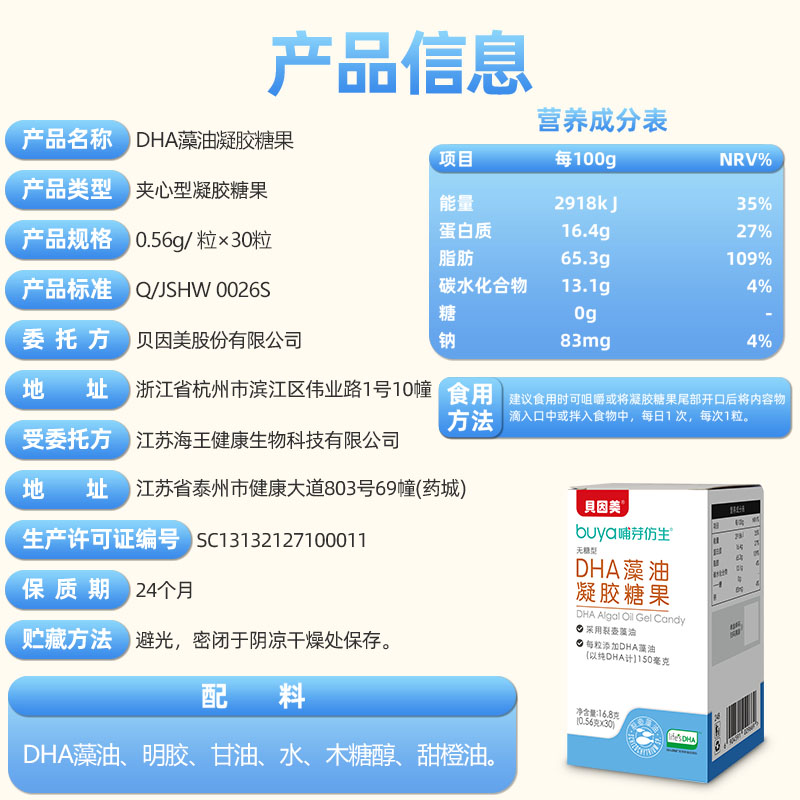 商品名称:贝因美DHA藻油婴幼儿宝宝孕妇儿童帝斯曼裂壶藻油营养品凝胶糖果
