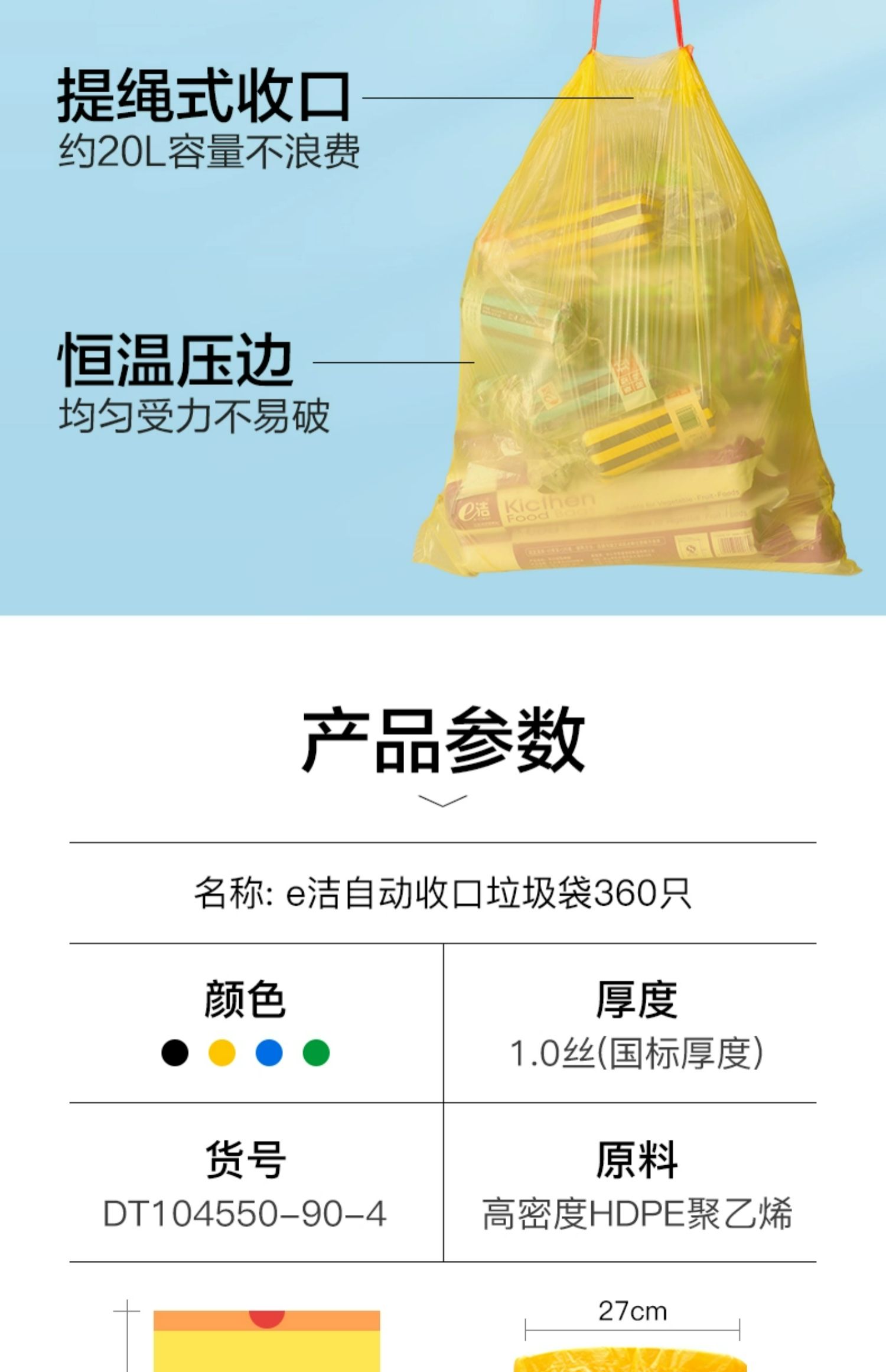 商品名称:e洁360只垃圾袋加厚自动收口家用手提式宿舍用抽绳塑料袋量贩装