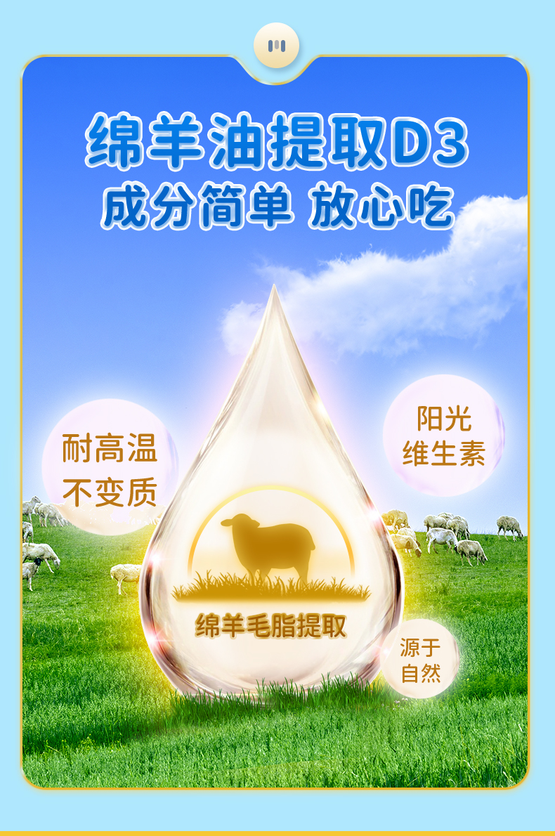 商品简介:绵羊油提取D3,耐高温、无多余添加,呵护宝宝眼睛健康,成长和免疫力功能,不含防腐剂,无人工香精,无色素,敏敏宝也可以吃!