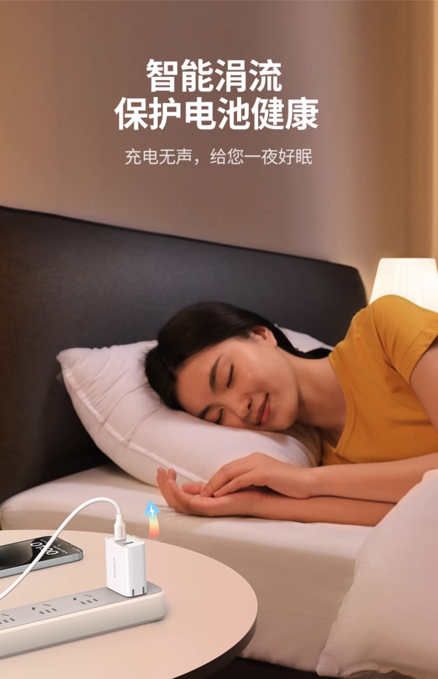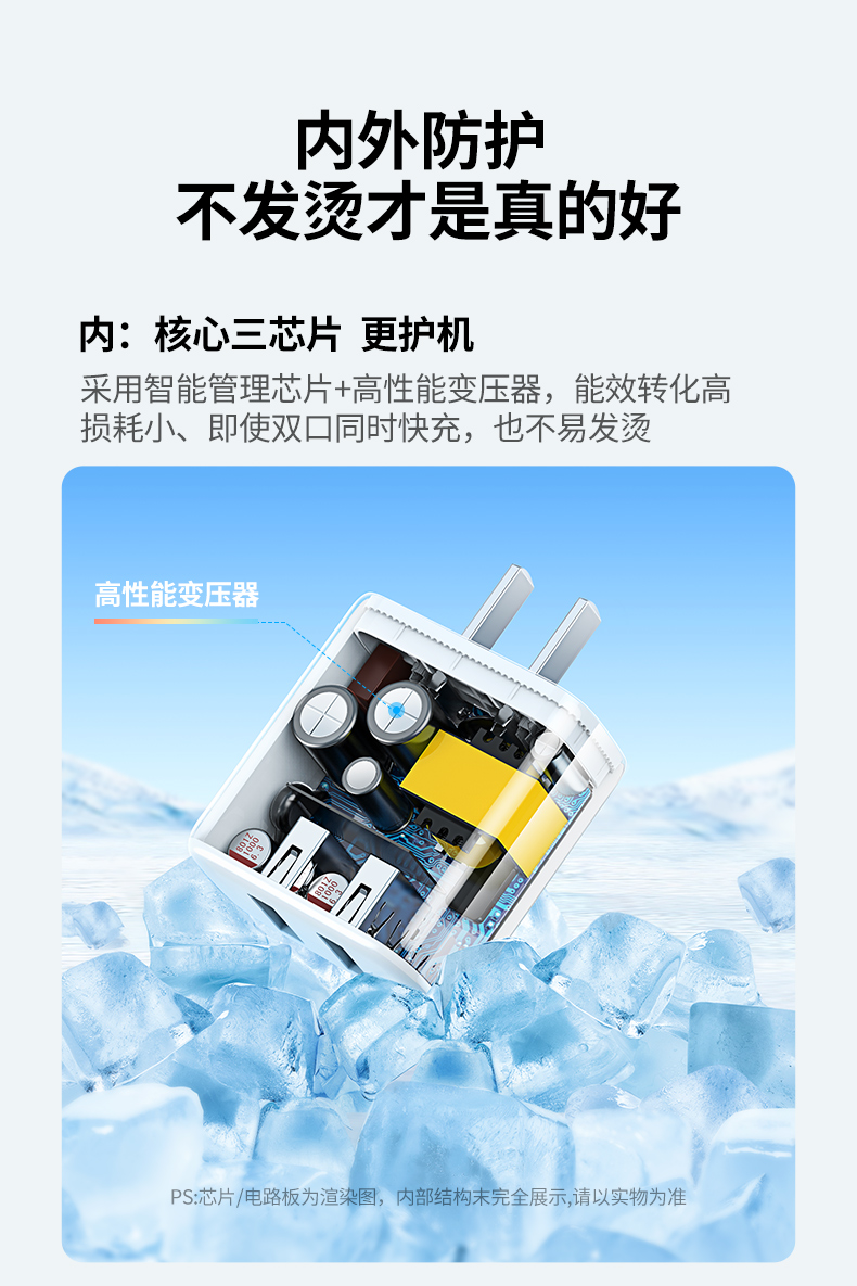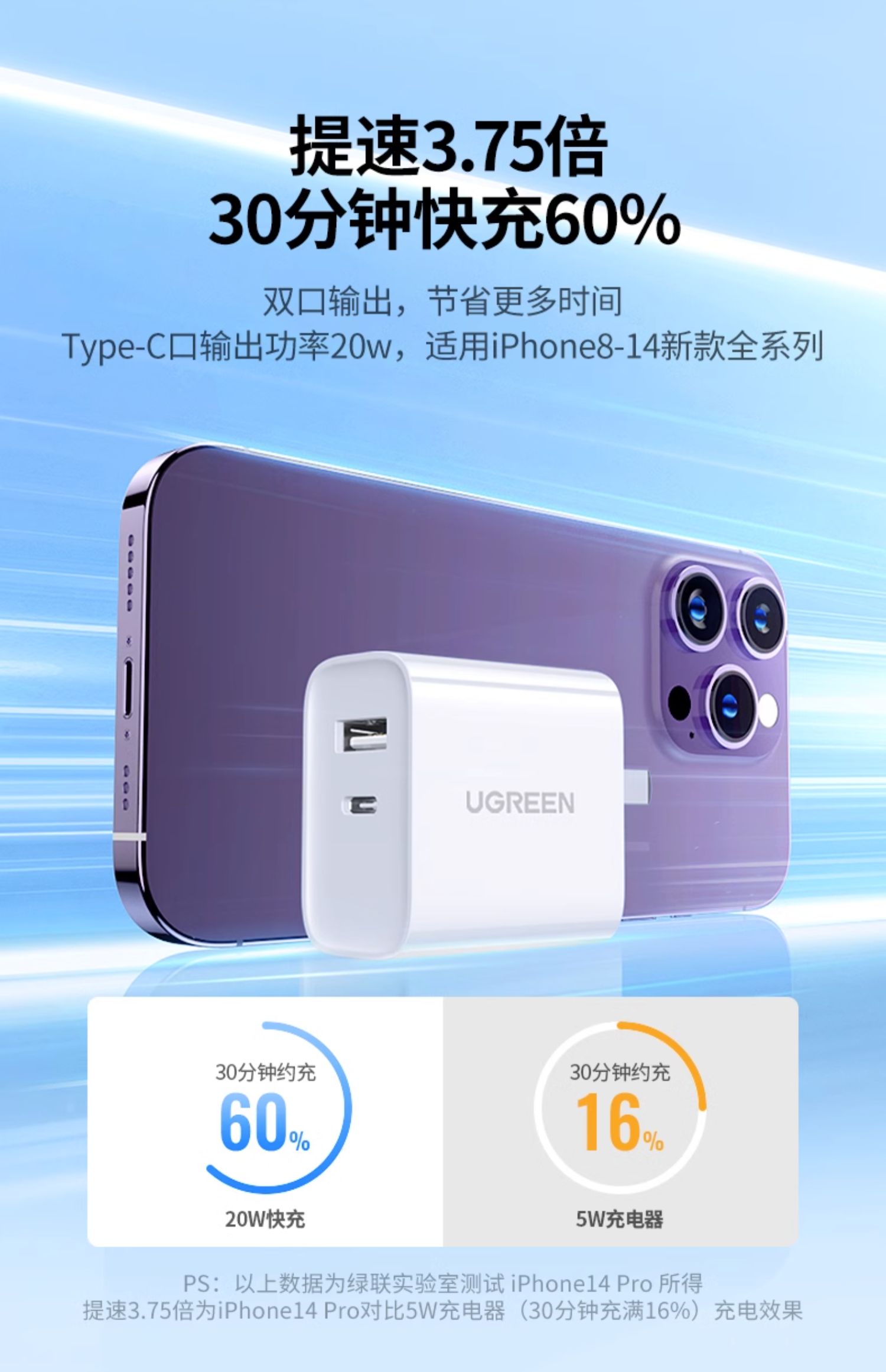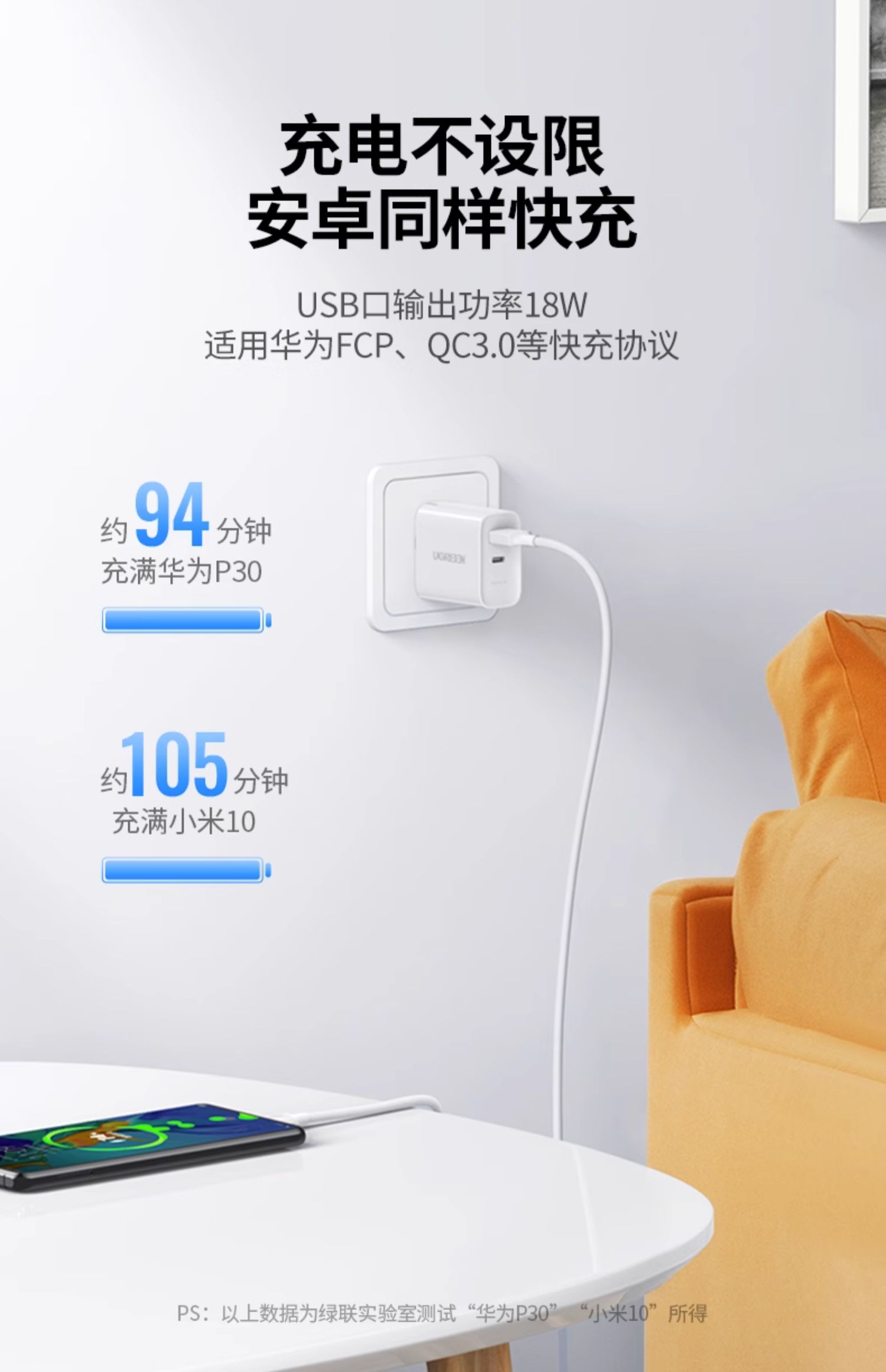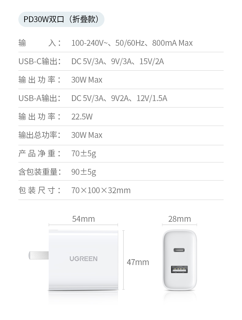 商品简介:绿联20w双口快充苹果安卓充电头,30分钟充满约60%,更高效快速。还要有过温,短路,高压,欠压,等等多重保护。让充电更安全。