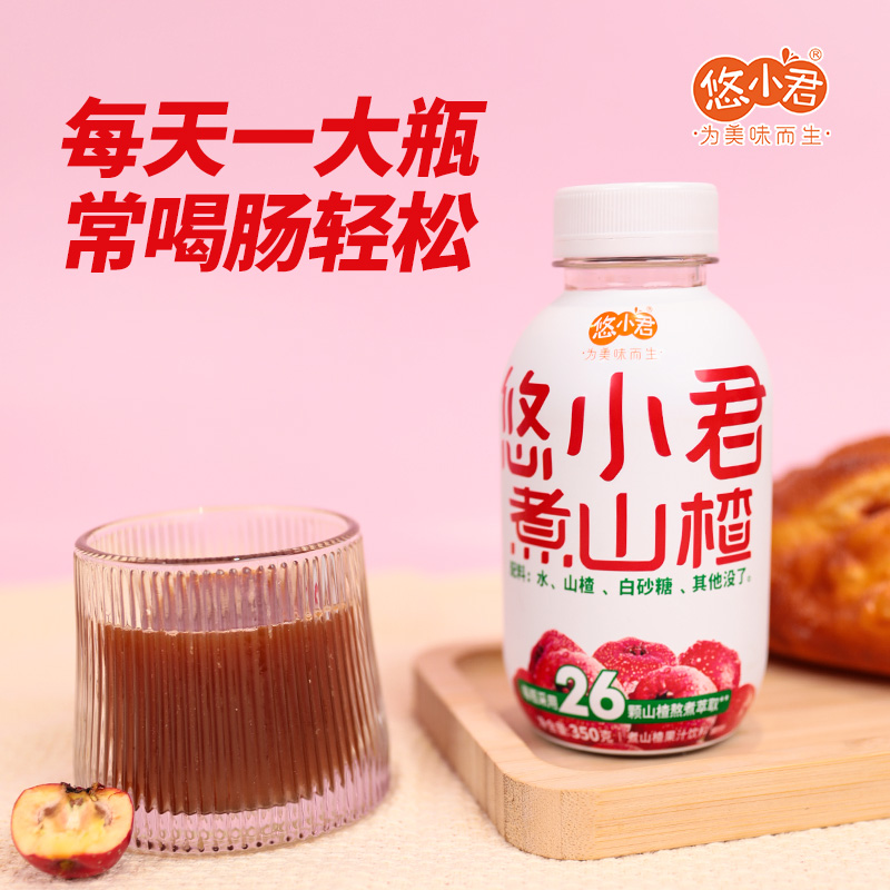 商品简介:真正0添加,悠小君煮山楂,配方极简,配料只有水、山楂、白砂糖,每瓶采用26颗山楂原果,果汁含量≥45%,口感清爽回甘,酸酸甜甜不发腻,26℃无菌条件下灌装,好喝又健康!!!