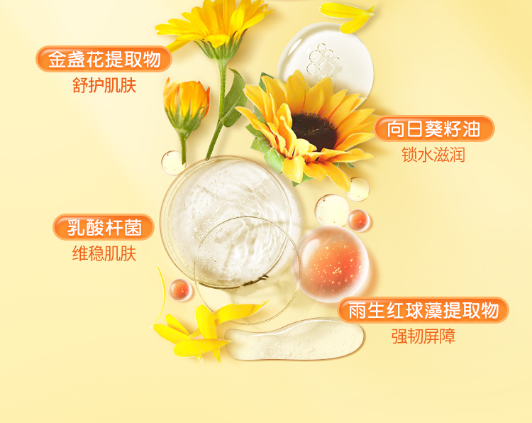 严选金盏花精粹,舒护肌肤小情绪,蕴含多种植物buff,让宝宝肌肤时刻保持活力,加乘向日葵籽油,沐浴后肌肤水当当~