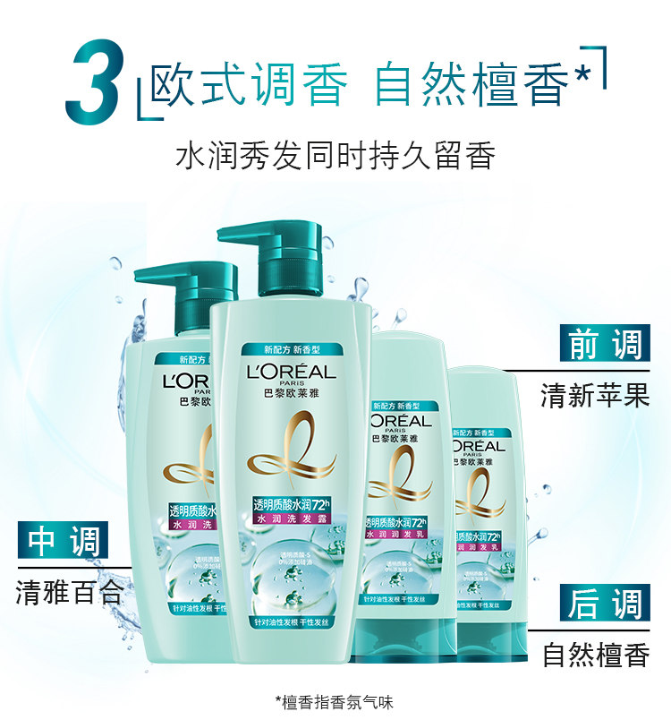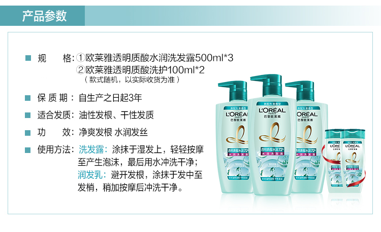 商品名称:欧莱雅透明质酸套装洗发水女控油去头屑柔顺无硅油洗发露持久清爽