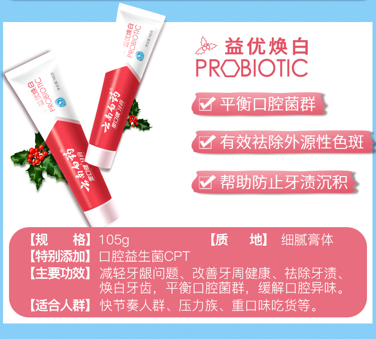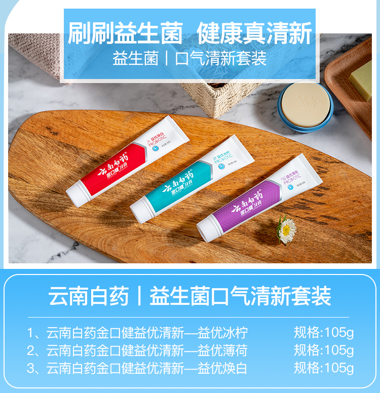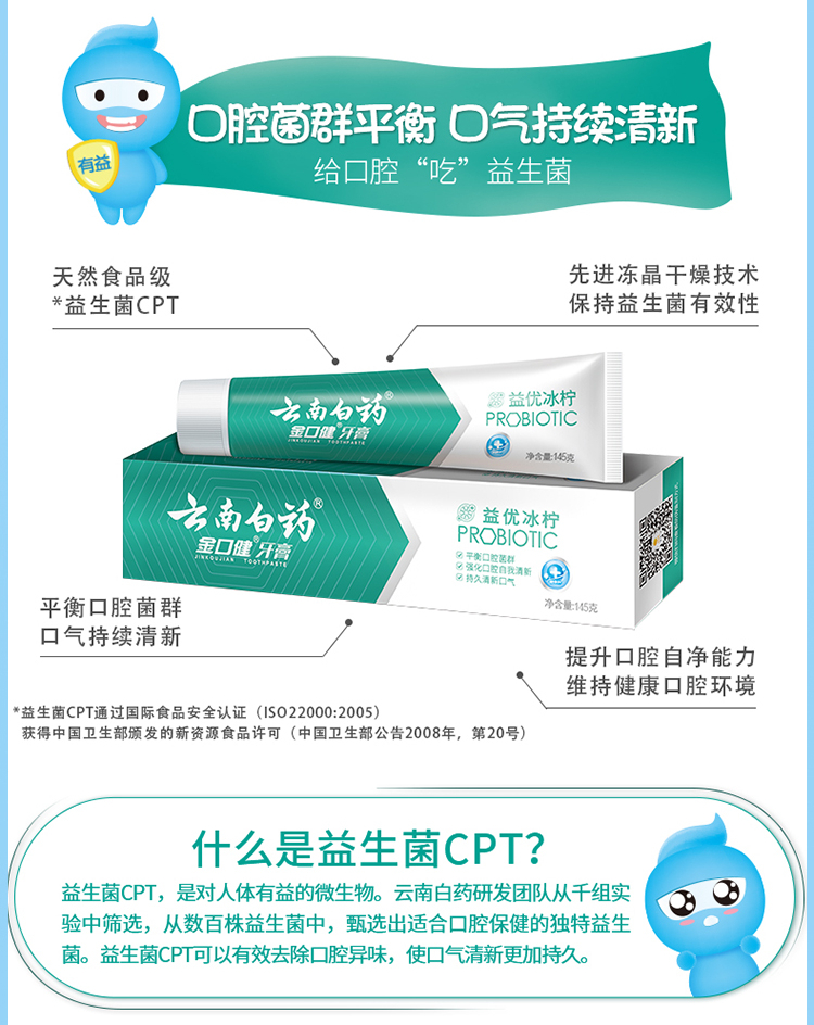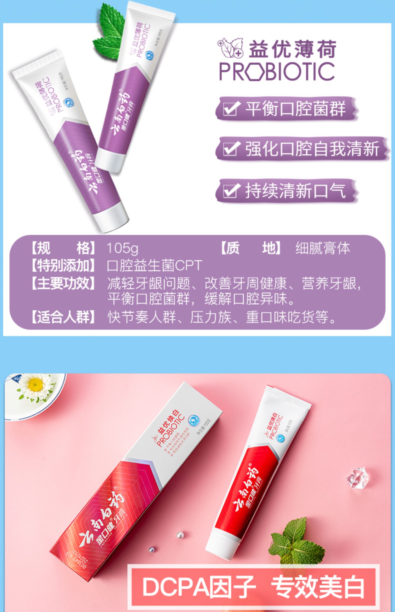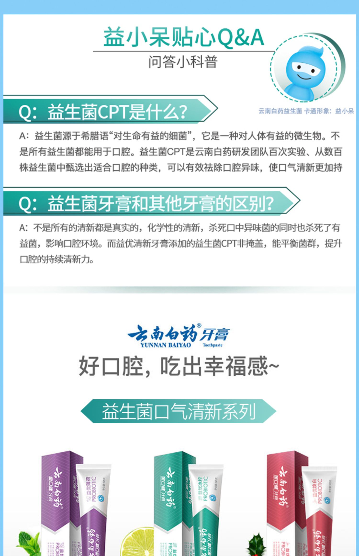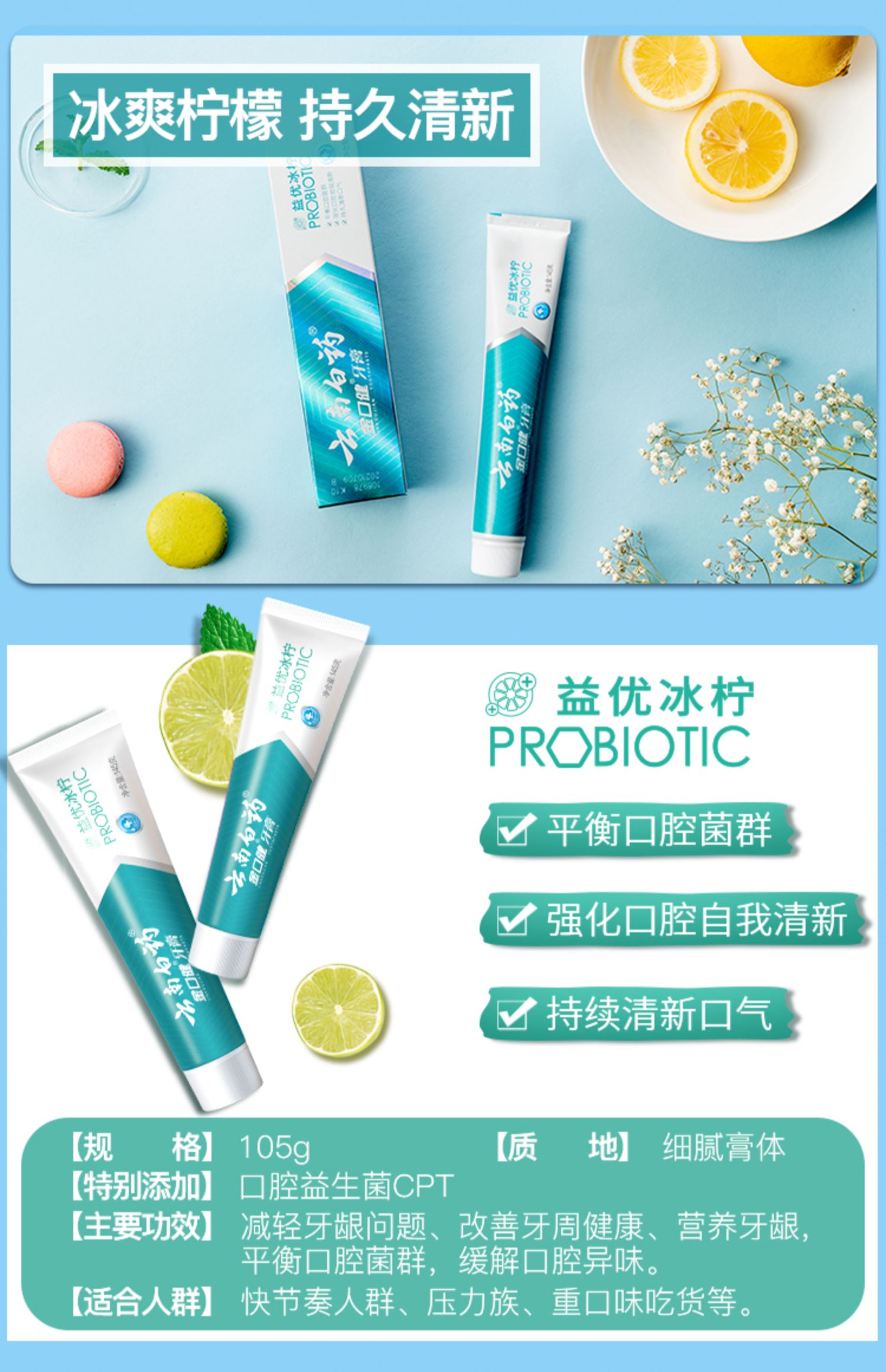 商品名称:云南白药金口健牙膏益生菌去黄美白亮白牙膏清新口气冰柠薄荷香型