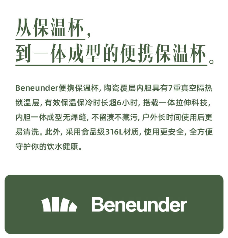 商品名称:Beneunder保温杯316L不锈钢陶瓷内胆保冷杯子便携水杯400ml日化